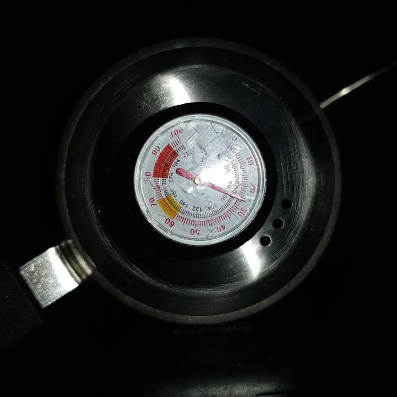 دارای ترمومتر یا دماسنج دقیق  روی درب کتری با دو مقیاس سانتیگراد و فارنهایت ( پنجره ی ترمومتر این مدل طبق تصویر چند خط و خش دارد.)