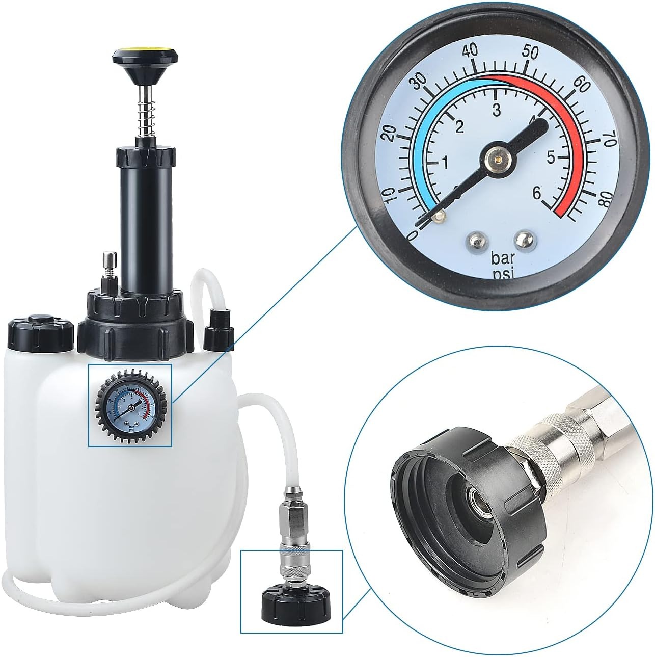 این مدل دارای طراحی مهندسیشده و مقاوم است. بدنهی دستگاه از پلاستیک فشرده و مقاوم در برابر خوردگی ساخته شده تا بتواند فشارهای بالا و تماس مداوم با روغن ترمز را بدون آسیب تحمل کند. پمپ دستی روی درب مخزن امکان ایجاد فشار لازم برای تزریق روغن را فراهم میسازد، در حالی که گیج فشار (Pressure Gauge) تعبیهشده روی قسمت بالایی، میزان دقیق فشار داخل مخزن تخلیه و تزریق روغن ترمز و کلاچ را نمایش میدهد.