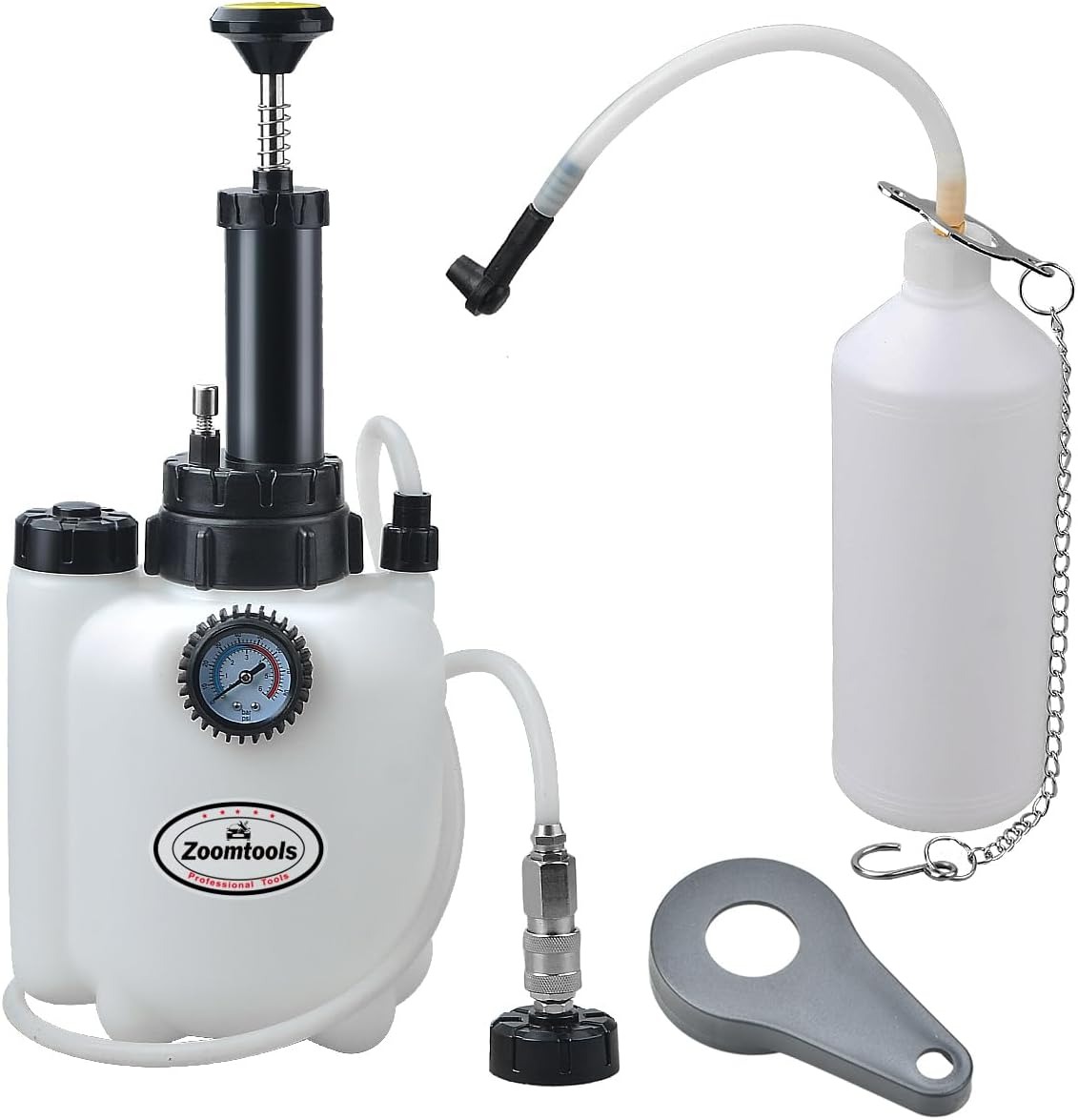 با استفاده از مخزن تخلیه و تزریق روغن ترمز و کلاچ Zoomtools، حتی یک نفر نیز میتواند عملیات تعویض مایع ترمز یا کلاچ را بهتنهایی انجام دهد. فقط کافی است مخزن را با روغن ترمز تازه پر کرده، شلنگ را به مستر سیلندر متصل کنید و با چند پمپ دستی، فشار لازم برای تزریق روغن در مدار را ایجاد نمایید. در انتها، با باز کردن پیچ هواگیری هر چرخ، مایع قدیمی به بطری جمعآوری منتقل خواهد شد.