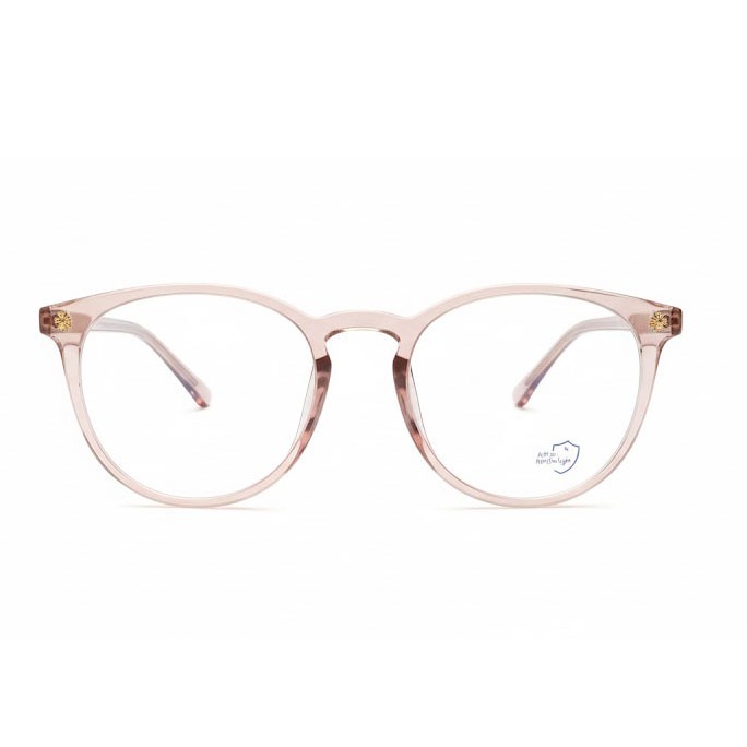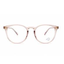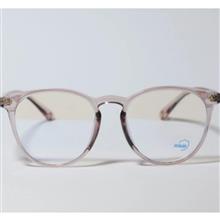 فریم این عینک با رنگ **شفاف صورتی ملایم** و طراحی گرد، ظاهری ظریف و مینیمال دارد.