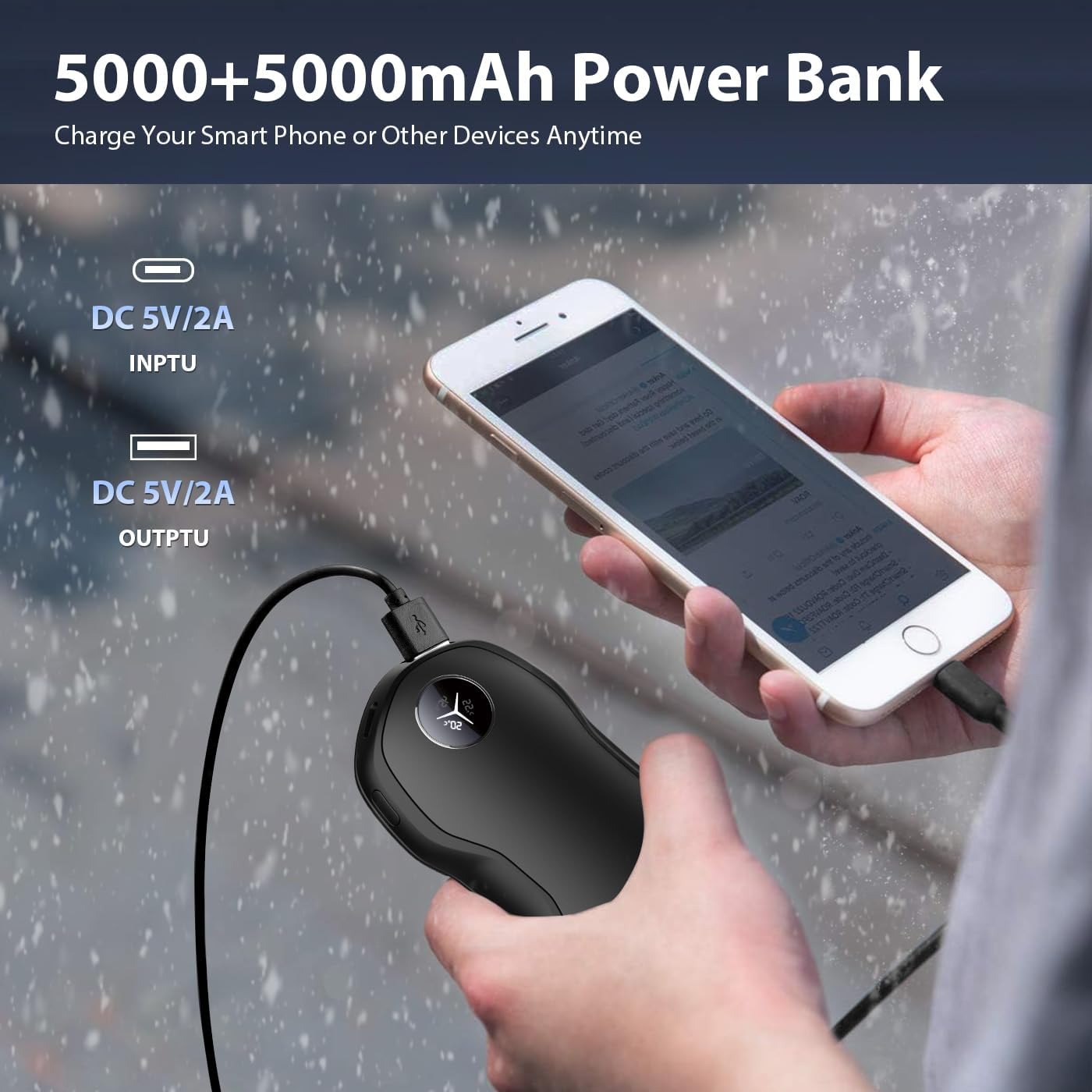 ویژگی منحصربهفرد دیگر این مدل، قابلیت پاوربانک آن است. هر واحد گرمکن دست دارای درگاه USB-C با ورودی و خروجی 5V/2A است که میتواند تلفن همراه یا هر وسیله الکترونیکی دیگر شما را شارژ کند. یعنی در واقع دو دستگاه در یک محصول دارید: یک گرمکن حرفهای و یک پاوربانک