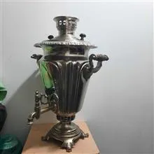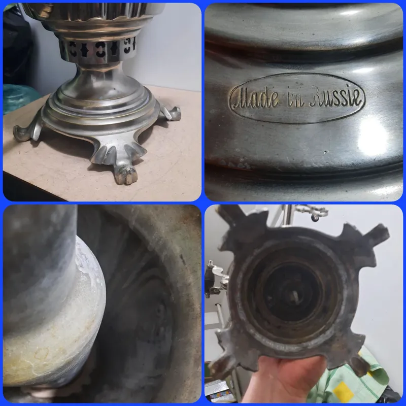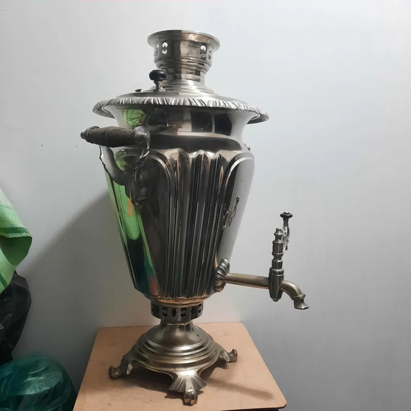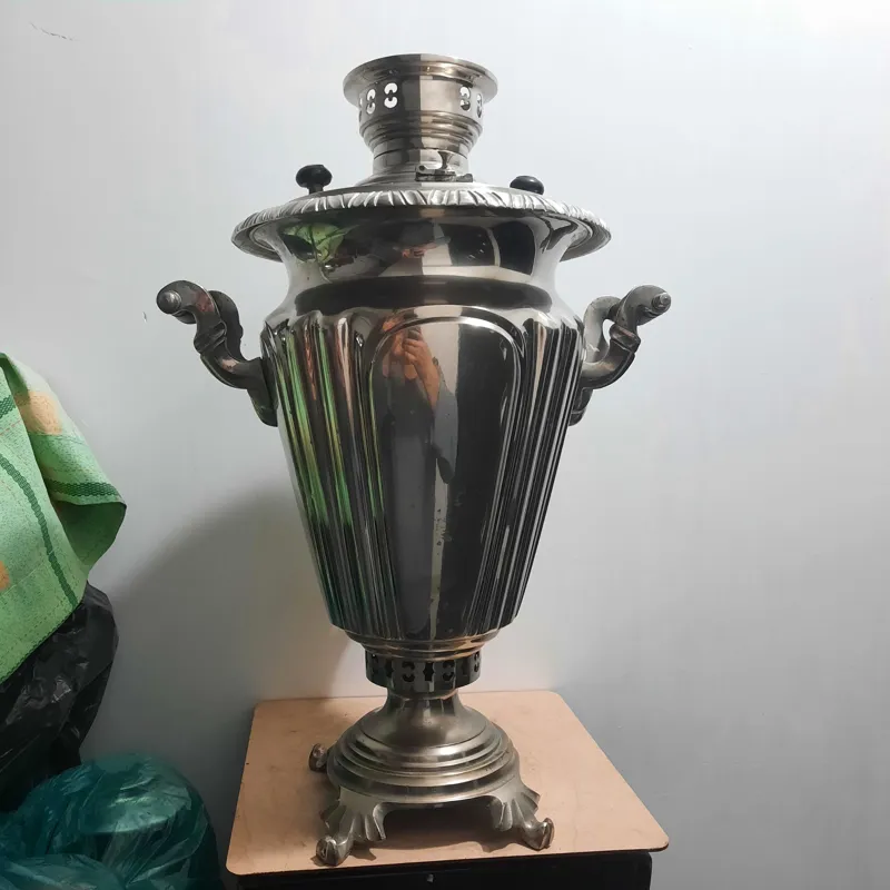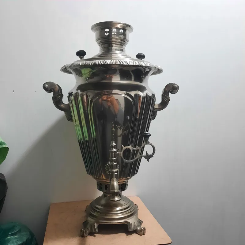 سماور روسی فوق العاده زیبا و بدون ایراد در حد نو خیلی کم استفاده شده است از داخلش معلوم تمام فابریک کروم ارتفاع 52 سانت اندازه 7 لیتری به شرط اصل روسی و قدیمی