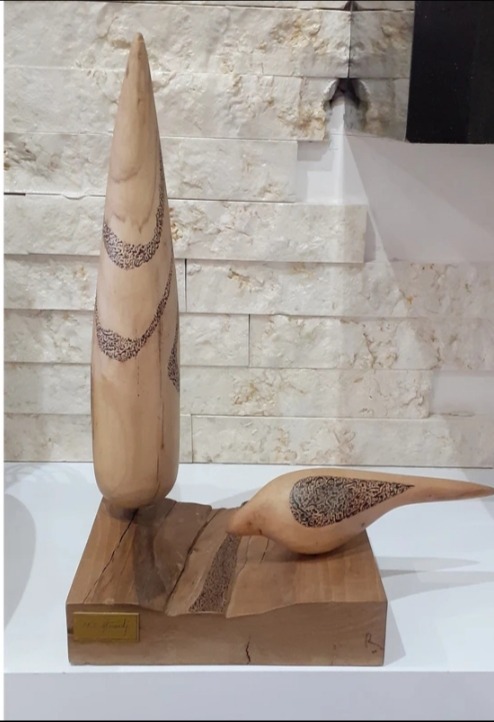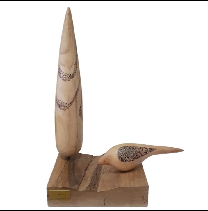 اثر فوق از مجموعه درختان سرو ایرانی و پرندگان می باشد که در انتخاب درختان و موضوع هماهنگی و ریتم خاصی حاکم است ، در مجموعه فوق درختان به طور کامل سنباده خورده و رگه های آن مشخص می باشد و با زیر سازی کامل که خوشنویسی با خط نستعلیق بر روی رگه ها اجرا شده ، و در نهایت با پلی ارتان پوشش داده شده است . خوشنویسی ها از اشعار مولانا می باشد.