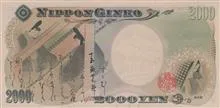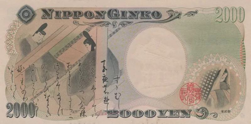 پشت اسکناس ژاپن : صفحه ای از خط اولین رمان ژاپنی مربوط به قرن 11 میلادی رمان گِنجی که آن را مشابه شاهنامه ایرانی میدانند .
