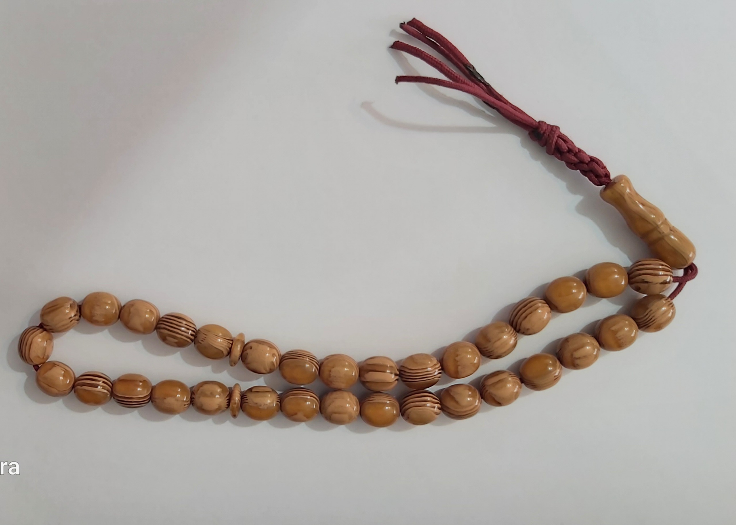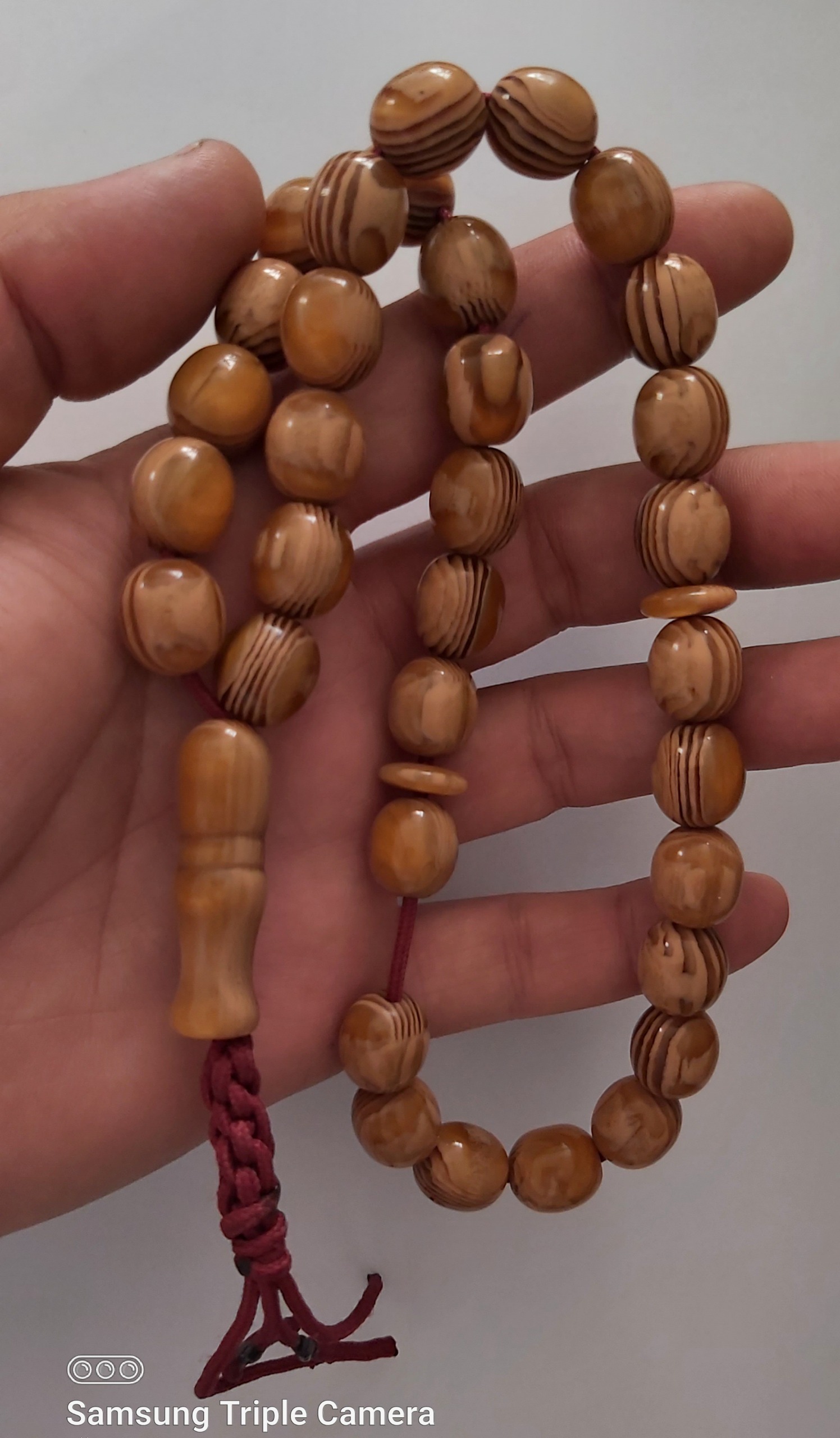 تسبیح کهربای پرچمی یا کره عسلی شمش اصلی تراش انگوری 6 میل می باشد و بسیار خودست است.
