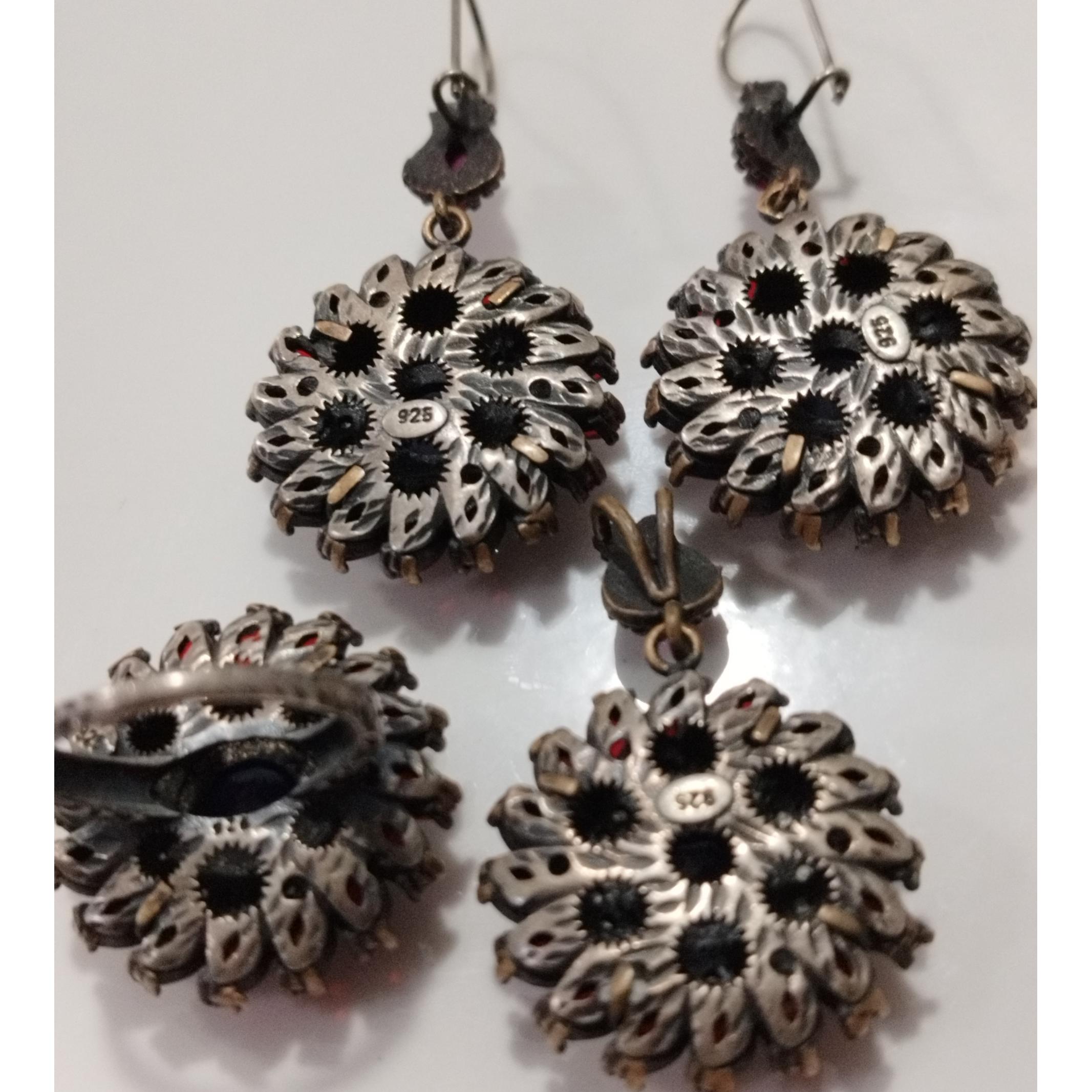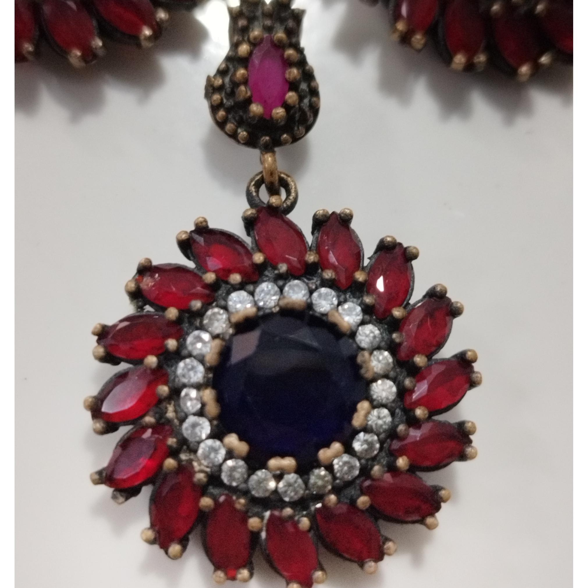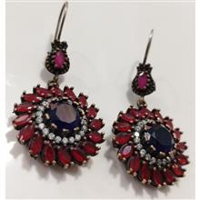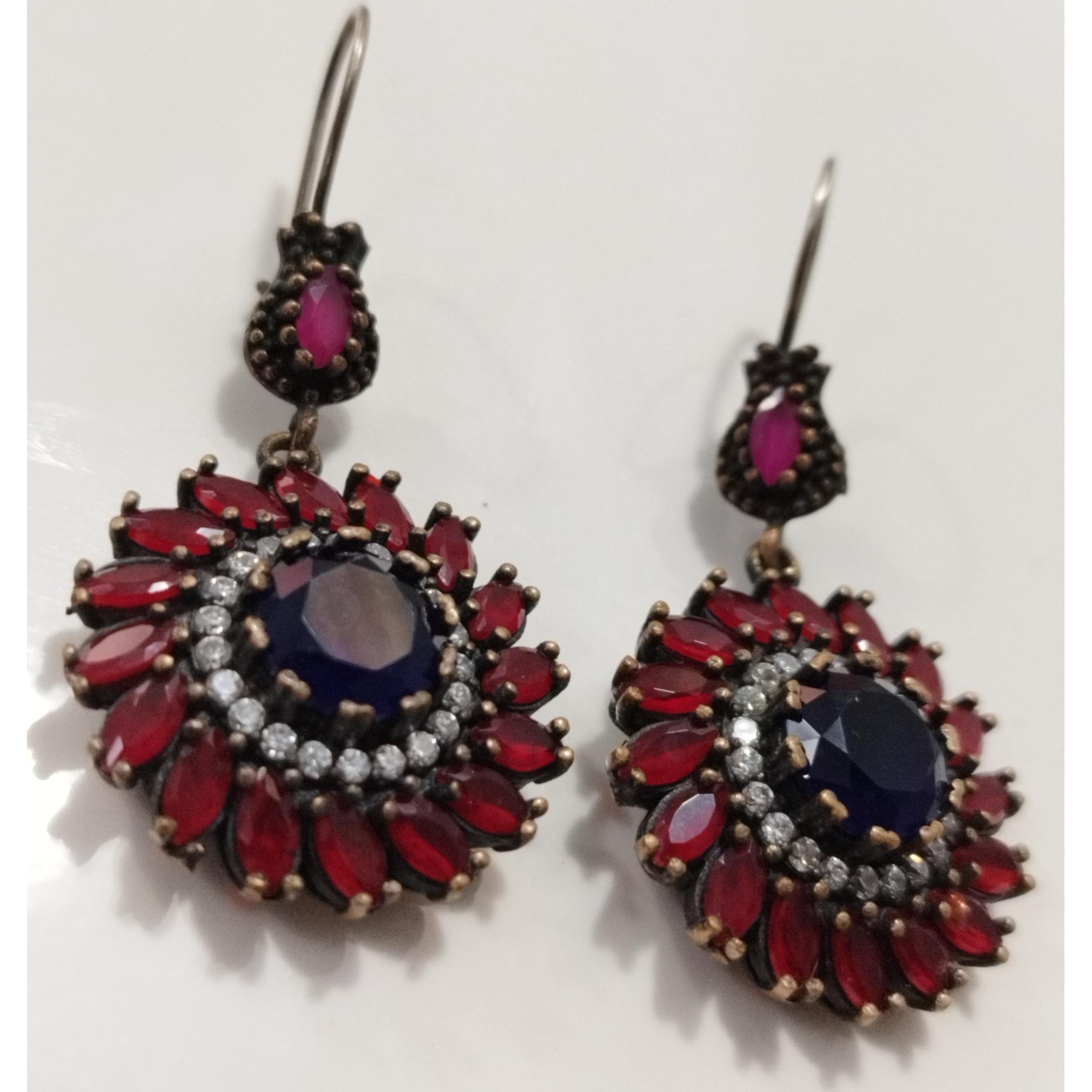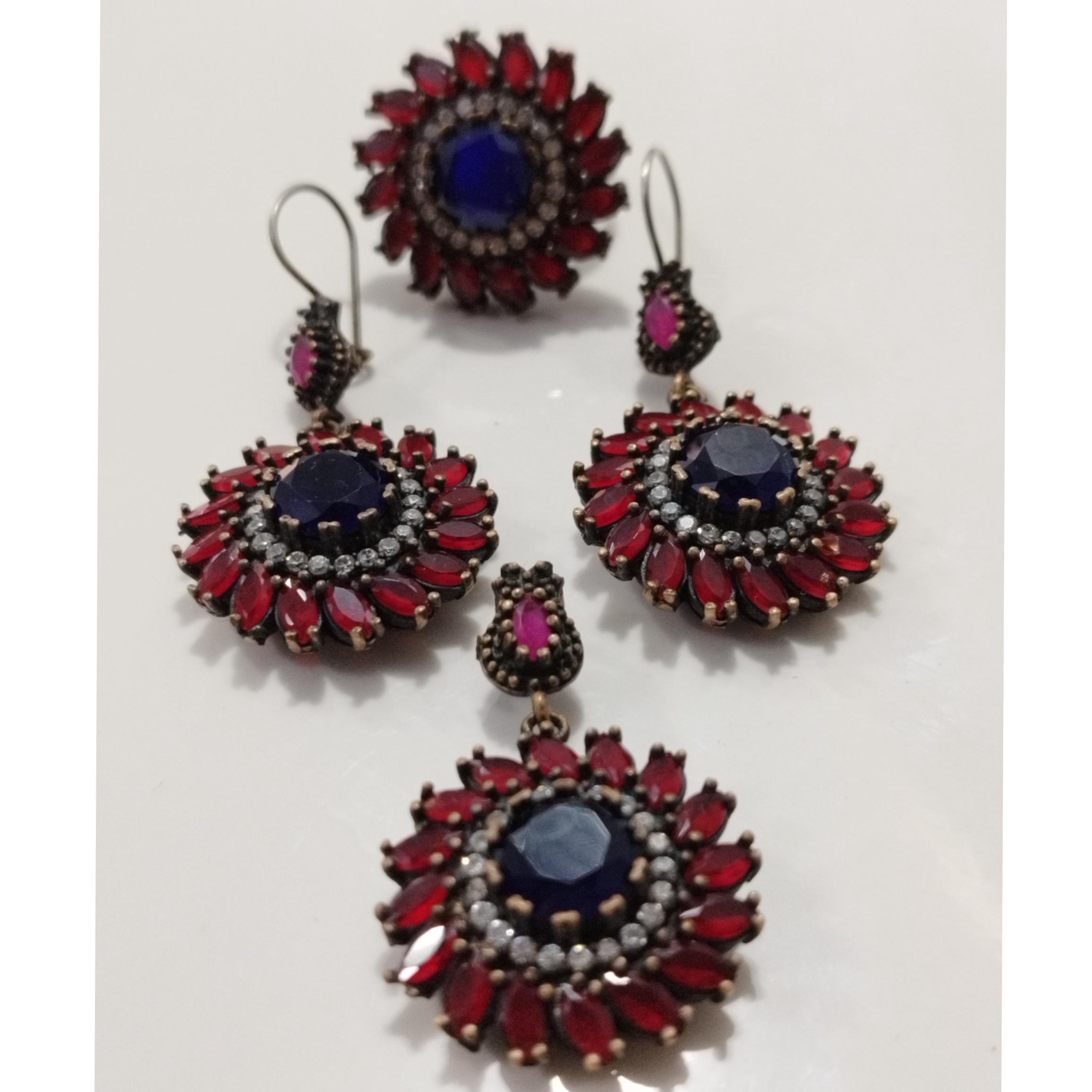 یک جفت گوشواره و یک انگشتر و یک آویز گردنبند یاقوت کبود و سرخ عثمانی قدیمی دستساز از جنس نقره و برنز