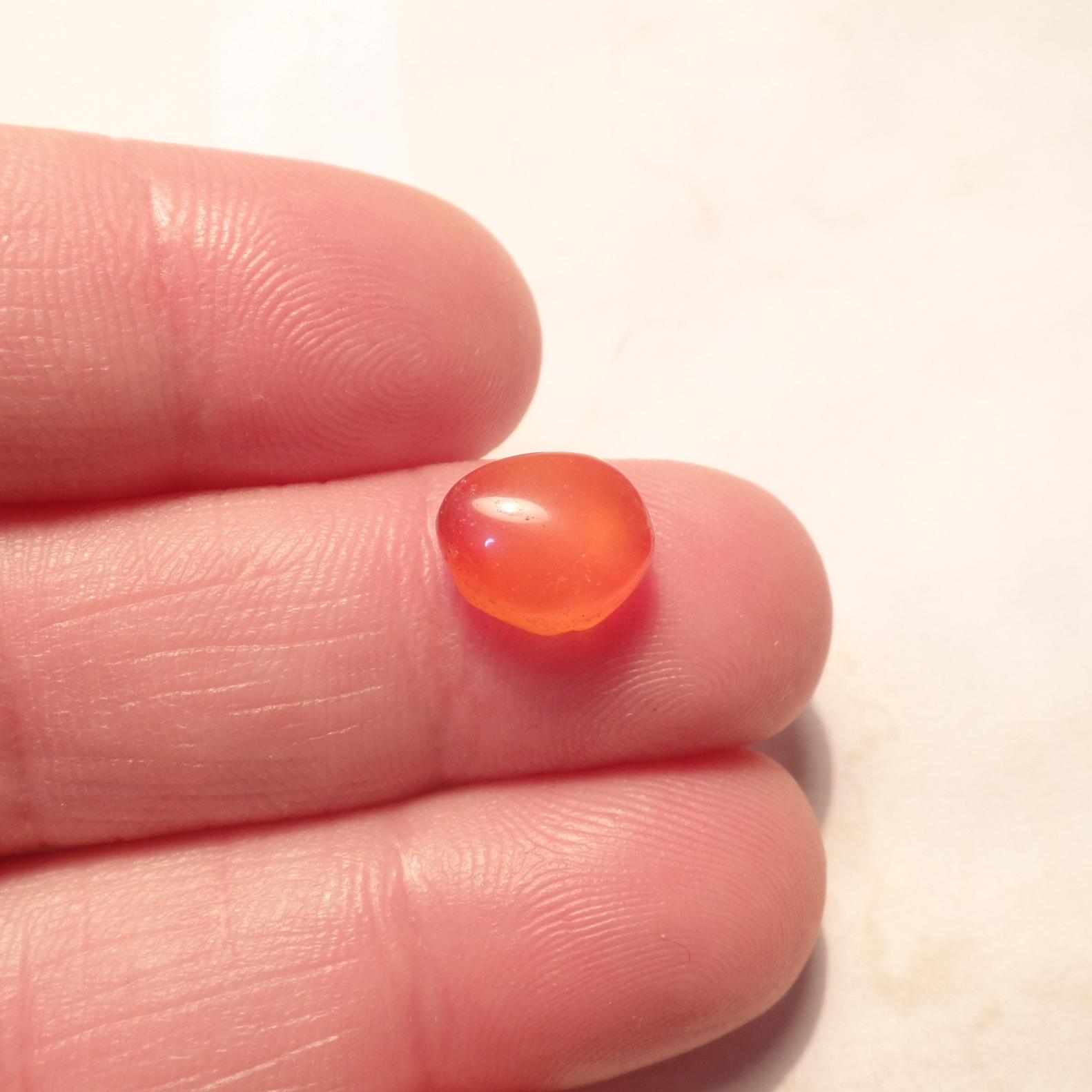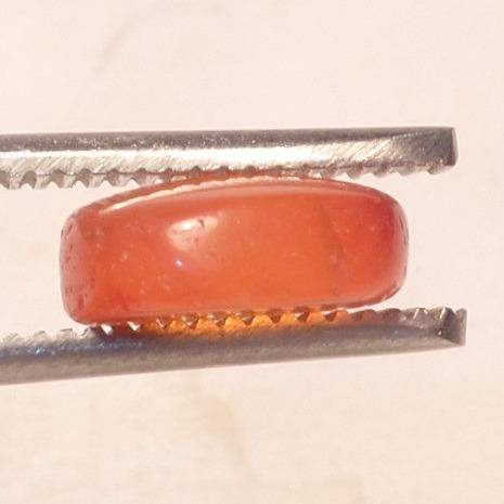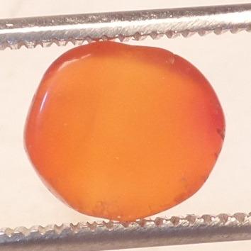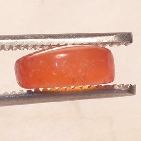 طرح : یک قطعه نگین عقیق نارنجی با رگه های طبیعی زیبا و ظریف طوق مانند پرتقالی خوش رنگ و خوش طبع و با تراش بیضی نامتقارن ( تراش دستی قدیم ) رو نسبتا محدب و زیر نسبتا تخت. تعدادی برص یخی طبیعی هم دارد. نگین نیاز به اصلاح و تنظیم تراش دارد.
