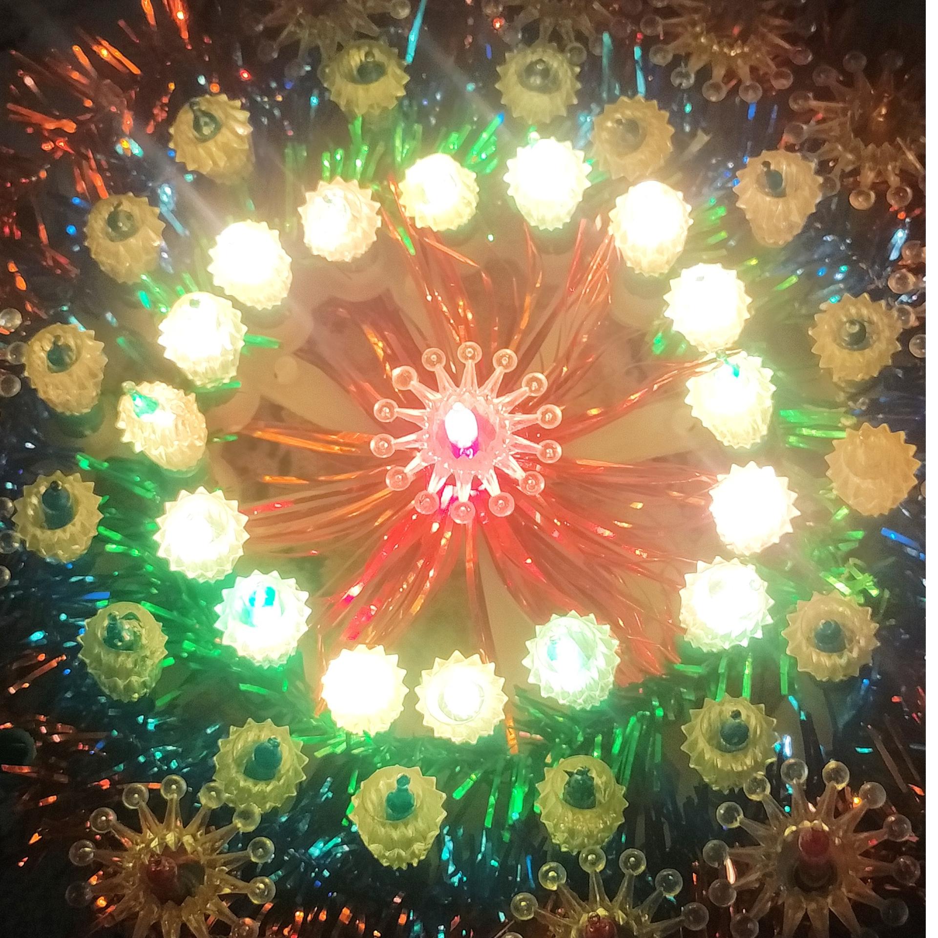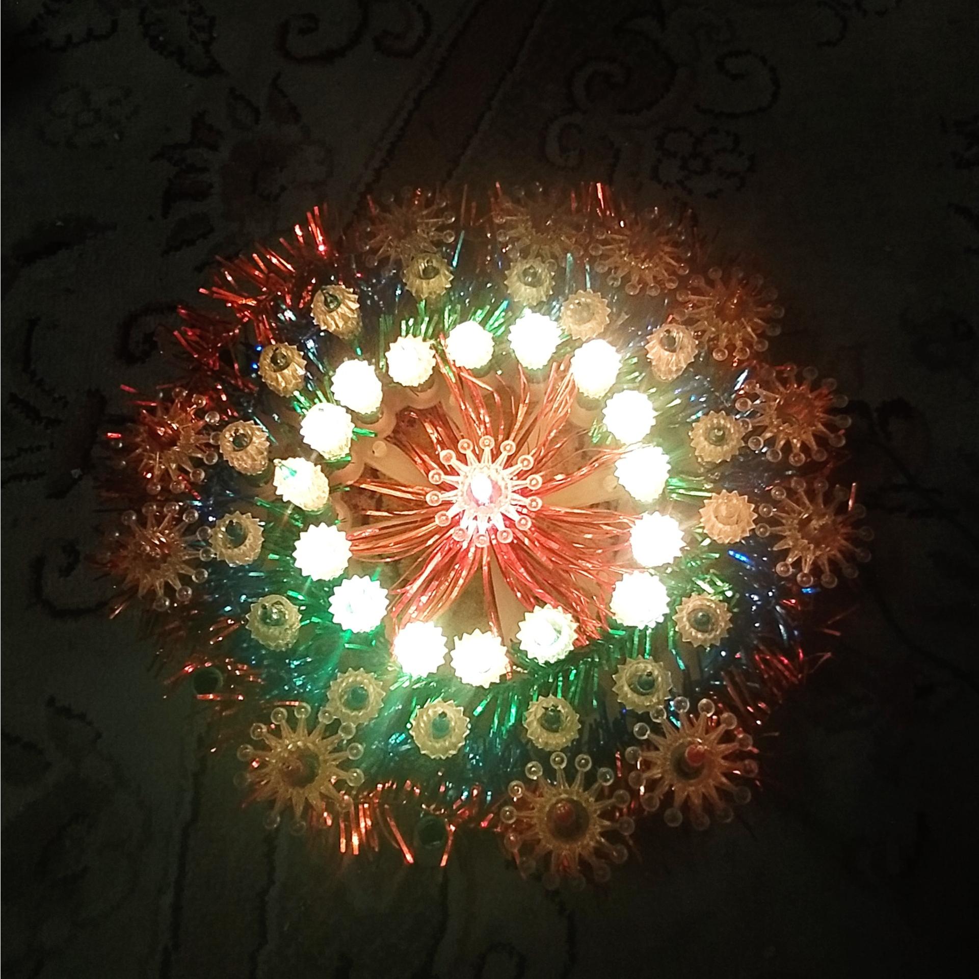 تاج نورانی مخصوص شب کریسمس با قدمت حداقل 50 ساله.زمان پهلوی ....قدیمی کمیاب و خارجی. ساخت ایران نیست. فقط ردیف وسط چراغهایش روشن میشود....بقیه اش قطعی دارد. چنتا لامپش هم شکسته . ولی در کل بسیار زیبا و نوستالژیک هست.
