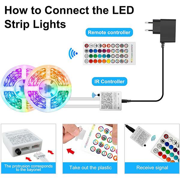 - میکروفن داخلی با حساسیت بالا، میتواند با ریتم یا ملودی موسیقی سازگار شود. روشنایی و سرعت نوار LED را میتوان از 1٪ تا 100٪ تنظیم کرد، همانطور که دوست دارید. نوار LED روشن از طریق یک کنترل از راه دور 40 دکمهای و یک برنامه کنترل میشود و در مجموع 16 میلیون