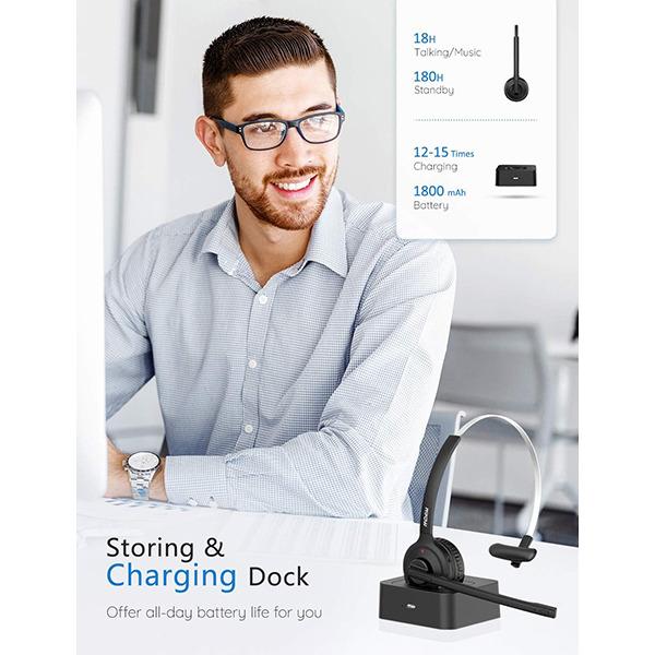 هدست بلوتوث میکروفون پیشرفته با قابلیت حذف نویز، سیگنال قوی BT، هدست راننده کامیون با طراحی راحت و پایه شارژ، هدفون بیسیم هندزفری برای اسکایپ/مرکز تماس/دفتر کار