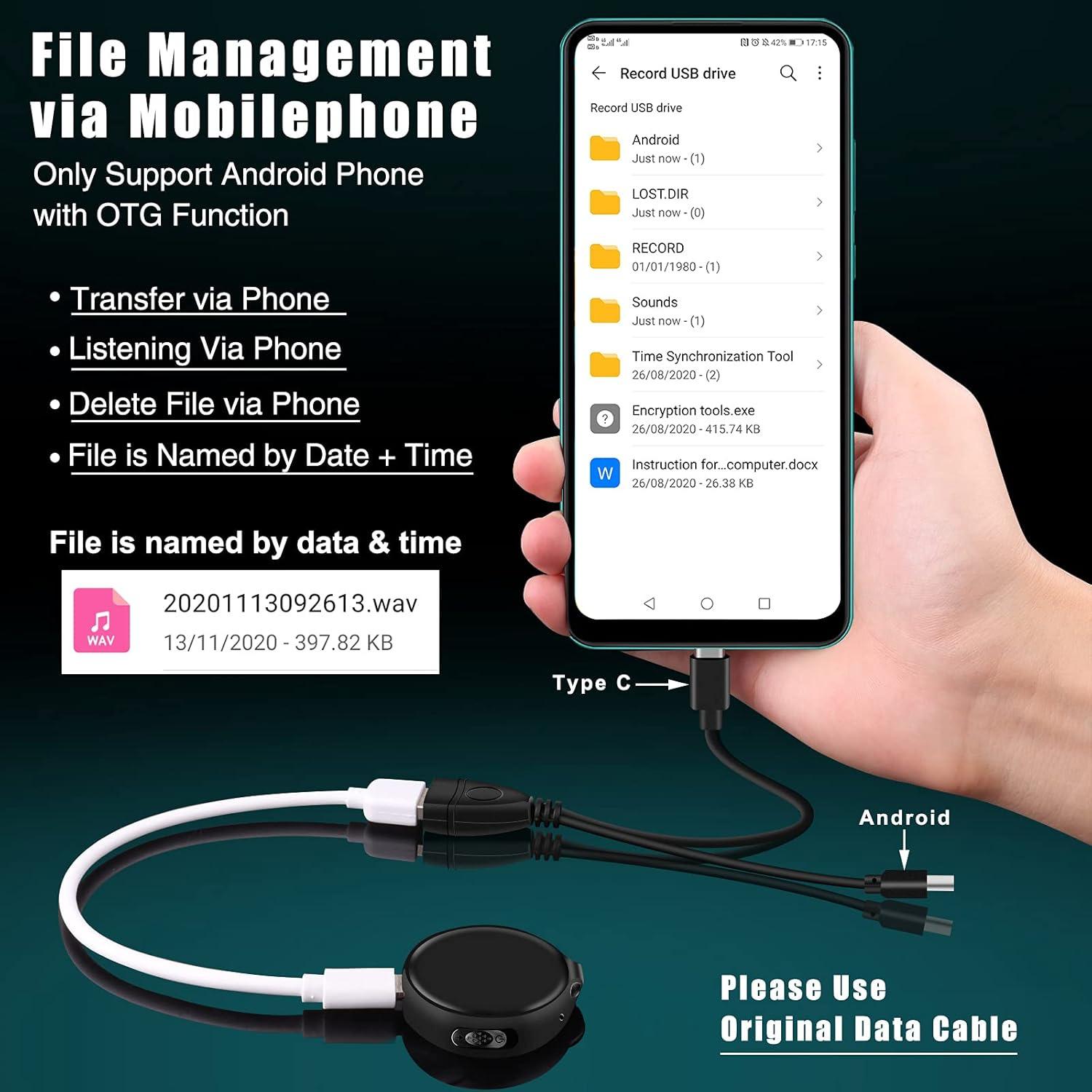 (اتصال OTG و مدیریت آسان فایل): ضبط کننده صدای کوچک با آداپتور Type-C / Micro-USB / آداپتور OTG برای کامپیوتر و گوشی اندروید. شما میتوانید به راحتی یا به سرعت فایل ضبط شده را از طریق رایانه یا تلفن اندروید دارای قابلیت OTG منتقل/پخش/مدیریت کنید.
