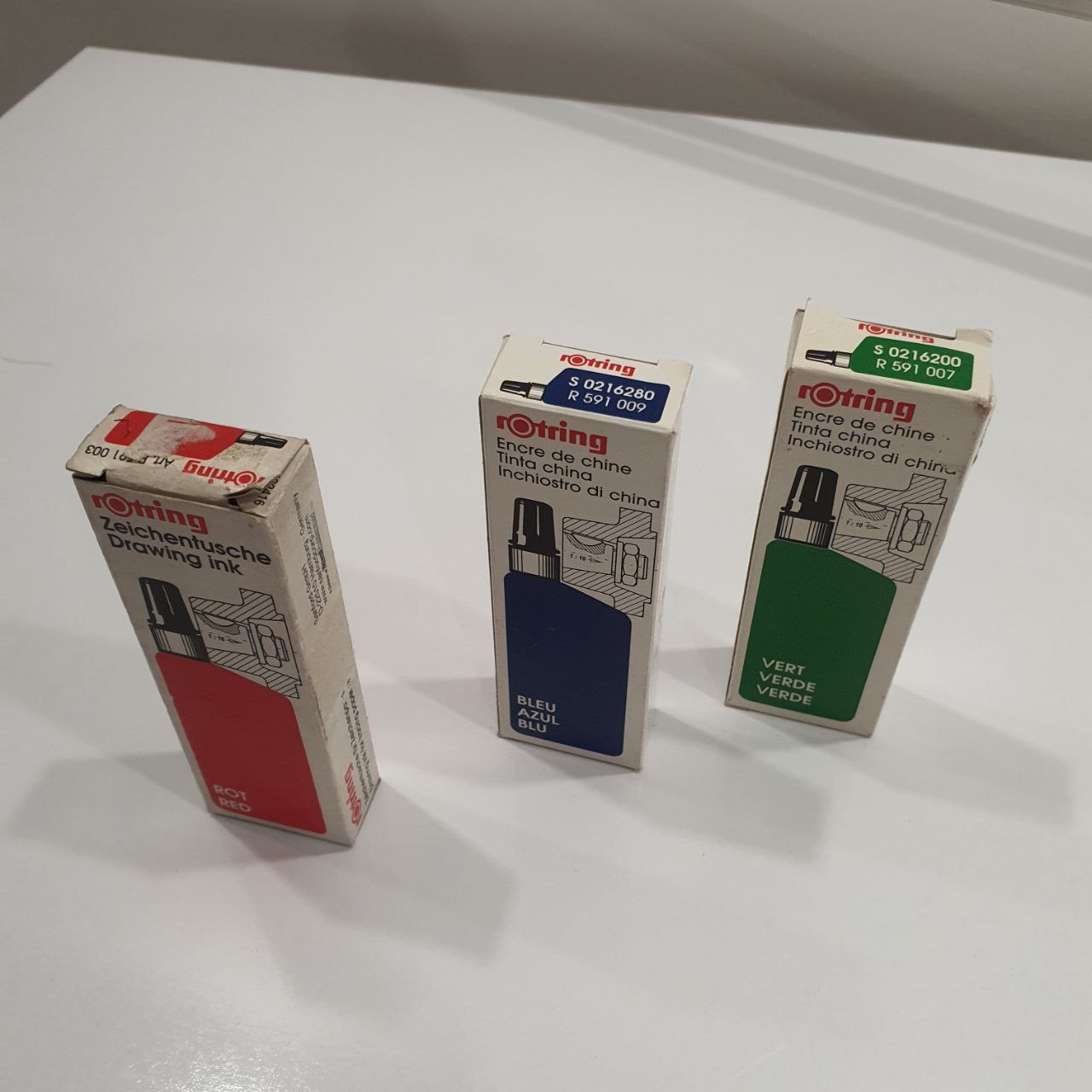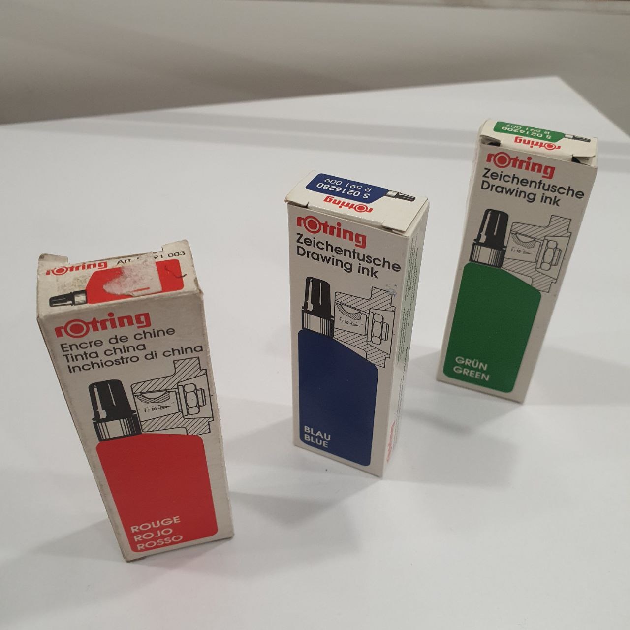 این آگهی شامل یک ست سه عددی جوهر اورجینال روترینگ (rOtring) ساخت آلمان است. این جوهرها از نوع تخصصی Zeichentusche (Drawing Ink) هستند که بهطور خاص برای استفاده در قلمهای فنی راپید (راپیدوگراف و ایزوگراف) تولید شدهاند.