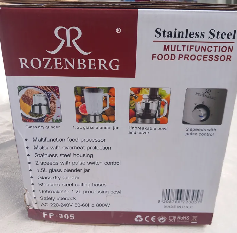 غذاساز روزنبرگ FP-305 با وجود لوازم جانبی با کیفیت بالا و همه کاره، همه عملکرد ها را در یک دستگاه ترکیب کرده است. این دستگاه با توان 800 وات با ظاهری زیبا طراحی شده است. جنس بدنه این محصول از استیل و جنس میله و تیغه آن از استیل ضد زنگ می باشد. ظرفیت مخلوط کن 1.5 لیتر و حجم ظرف خردکن آن 1.2 لیتر است. مجموعه Rozenberg دارای پایه ضد لغزش است. غذاساز روزنبرگ FP-305 دارای تنظیمات دو سرعته همراه با عملکرد پالس می باشد. از موتور در برابر گرمای بیش از حد محافظت می کند.
