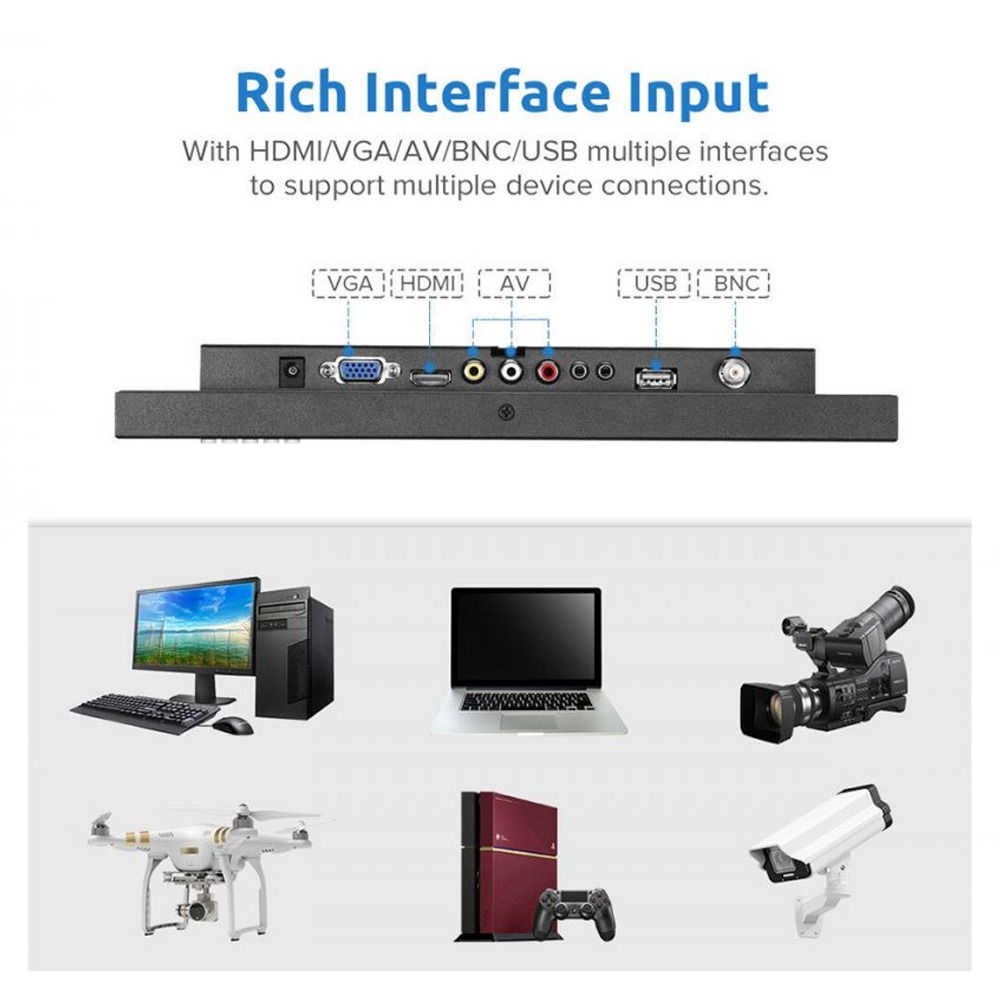 قابل نصب در خودرو: این مانیتور با ولتاژ 12 ولت خودرو نیز کار میکند، بنابراین بهراحتی میتوانید آن را در خودرو نصب کرده و بهعنوان مانیتور برای سیستمهای چندرسانهای، دوربین عقب یا DVR خودرو استفاده کنید. مانیتور 13.3 اینچ: صفحهنمایش IPS با وضوح اصلی 1366×768 پیکسل و روشنایی 250 نیت، زاویه دید گسترده 160 درجه. تجربهای رنگارنگ و شفاف در تماشای تصاویر به شما ارائه میدهد. مانیتور HDMI: نمایشگر 13.3 اینچی با پورت HDMI، قابل استفاده بهعنوان مانیتور دوم برای کامپیوتر، لپتاپ، Raspberry Pi، پلیاستیشن 4، Xbox One و حتی بهعنوان مانیتور برای دوربین DSLR. سازگار با تمام دستگاههایی که خروجی HDMI دارند. مانیتور CCTV: ایدهآل برای استفاده بهعنوان مانیتور امنیتی، با پشتیبانی از ورودیهای BNC، HDMI و VGA. قابل اتصال به کامپیوتر، لپتاپ، دوربین، ورودی AV برای DVD یا TV Box. همچنین میتواند فلش USB را بخواند و تصاویر و ویدئوها را از طریق آن پخش کند. پشتیبانی از نصب VESA و ریموت کنترل: این مانیتور علاوه بر امکان قرارگیری روی پایه رومیزی، قابلیت نصب روی دیوار را نیز دارد. دارای بلندگو داخلی برای تماشای راحتتر ویدئو. بدنه پلاستیکی سبک و قابل حمل است. سازگاری با دستگاههای مختلف: مانیتور قابل حمل 13.3 اینچی با پورت HDMI، کاربردهای متنوعی دارد. مناسب برای PS3، PS4، WiiU، Xbox 360، Raspberry Pi مدلهای 1، 2 و 3، تجهیزات صنعتی و نمایشگر تجهیزات پزشکی.