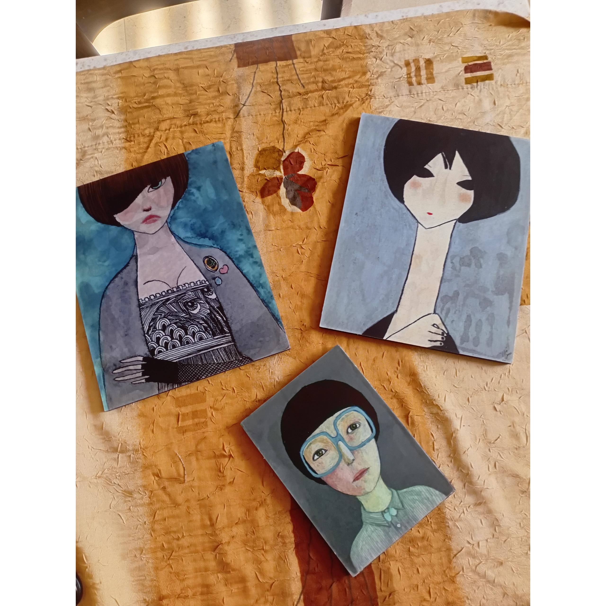 نقاشی ها کار دست هست و ازشون عکاسی شده و جنس مقوا مانند نوع شبیه گلاسه مرغوب چاپ شده و به صورت تخته شاسی در اوردن