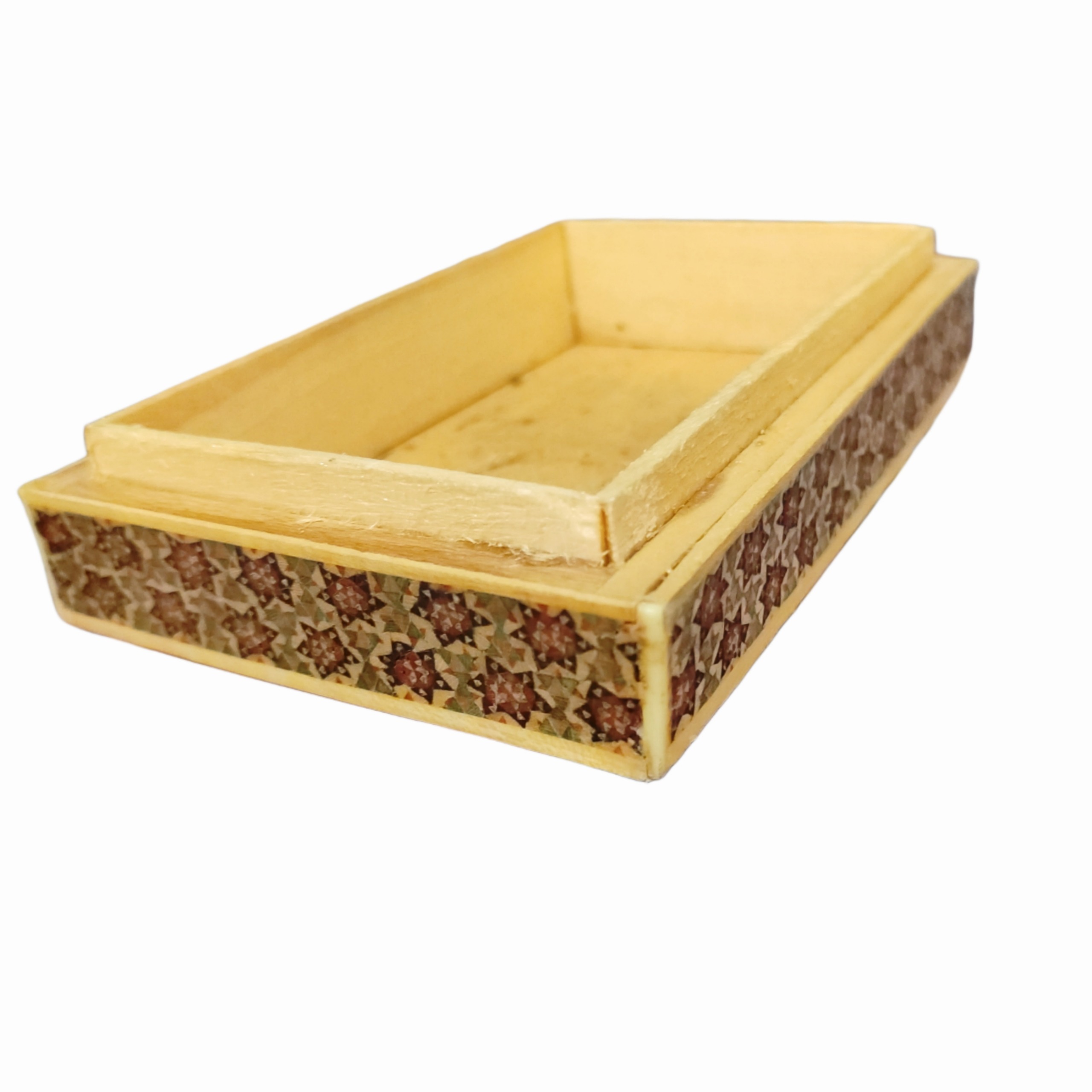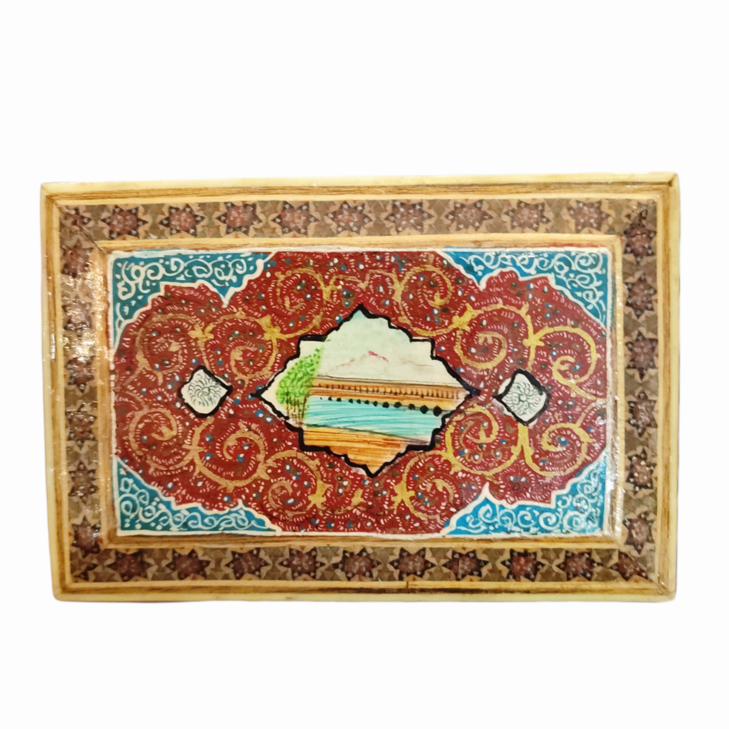 جعبه چوبی هست و روی آن و بدنه ی آن خاتم کاری شده است و تماما کار دست است.