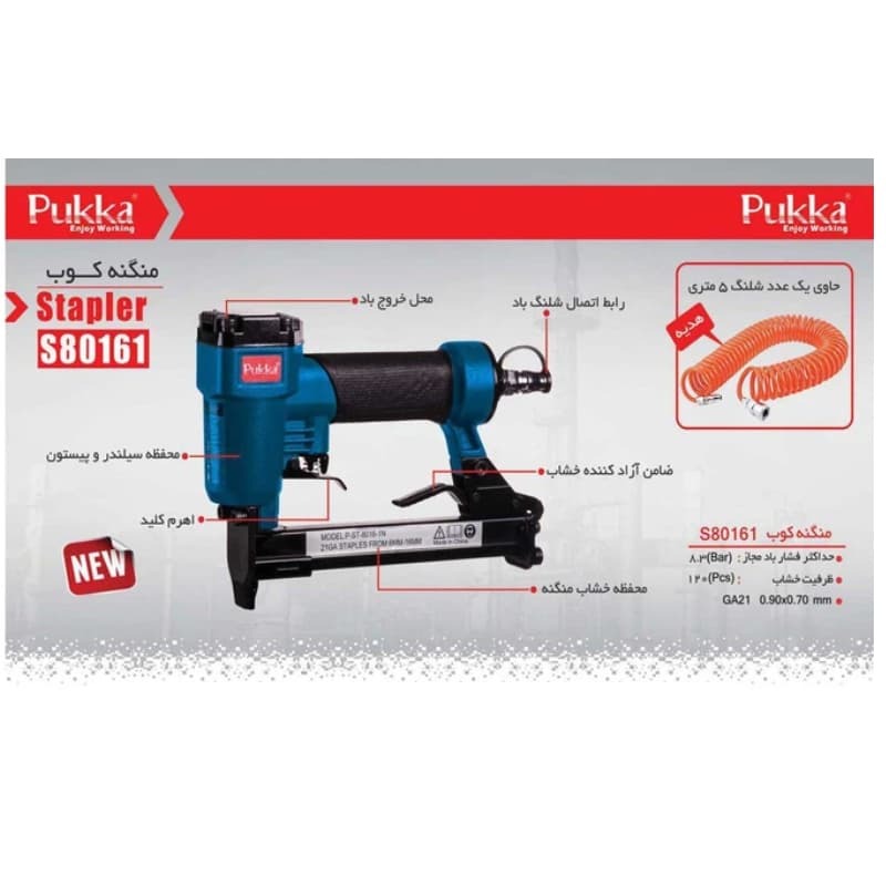 منگنه کوب بادی پوکا S80161 با طراحی فوق حرفه ای و از بدنه دایکاست آلمینیوم ساخته شده است. دسته این محصول دارای روکش پلاستیکی می باشد که از خستگی هنگام کار جلوگیری می کند. این دستگاه دارای یک عدد شلنگ فنری که مخصوص روغن کاری داخل دستگاه است و از طریق ورودی باد