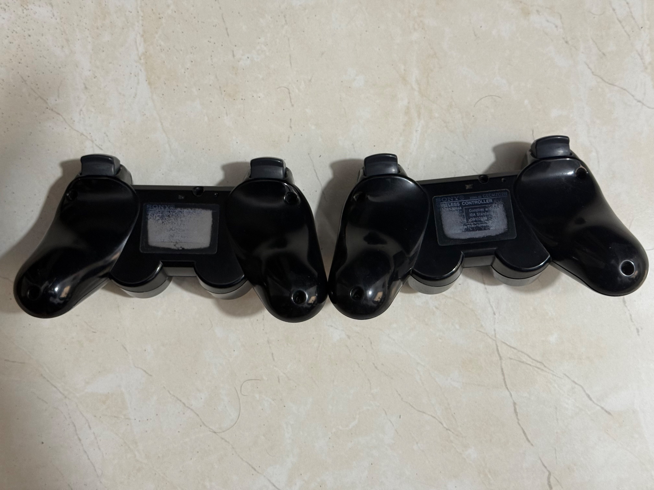 دو عدد دسته پلی استیشن 3 فروش باهم ، یک دسته اصلی ( سمت راست  ) و یک دسته های کپی بدون شوک دسته ها روشن هست و همه دکمه ها کار می کند