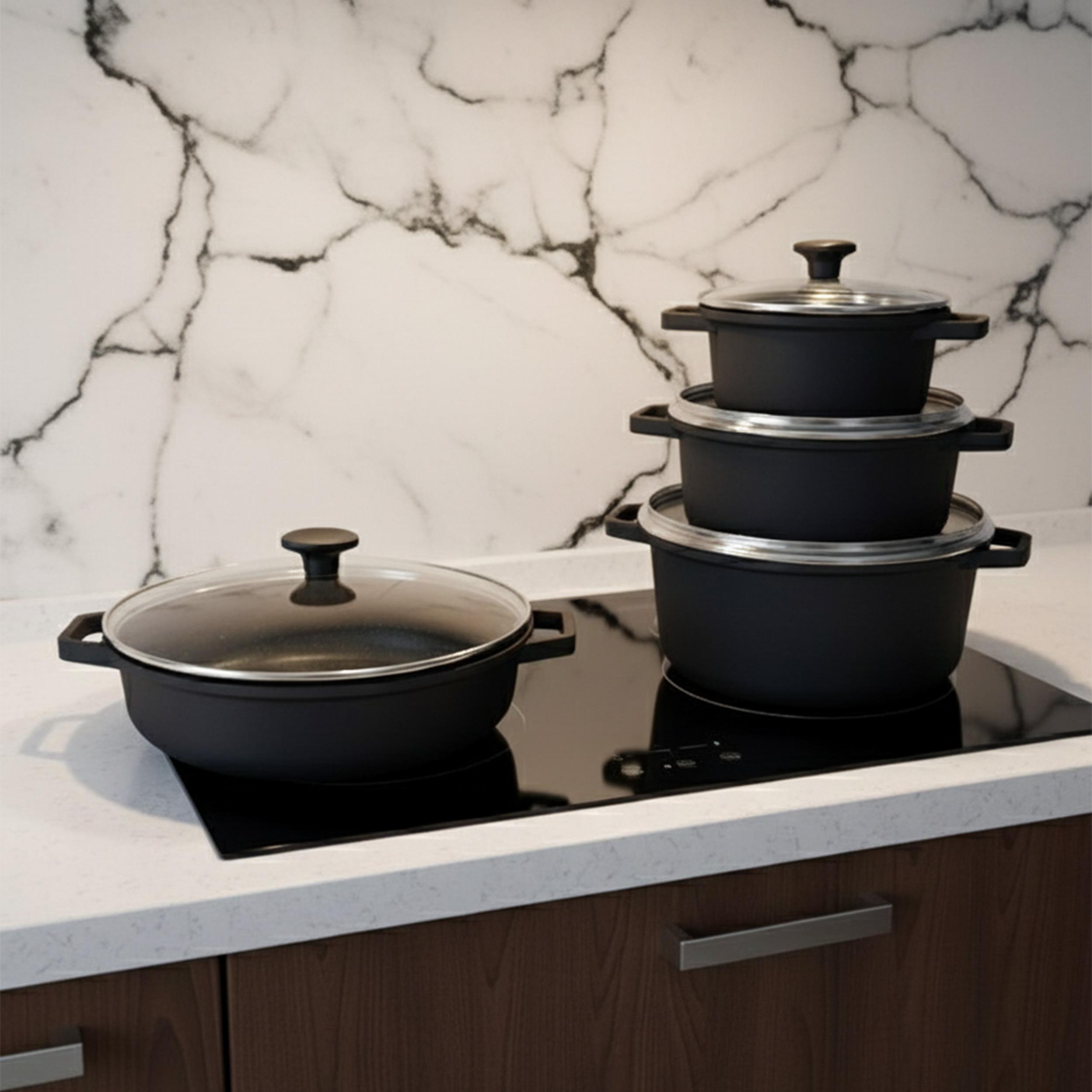 وزن ظروف : قابلمه سایز 20: 850 گرم، قابلمه سایز 24: 950گرم، قابلمه سایز 28: 1350 گرم، تابه سایز 28: 1000 گرم