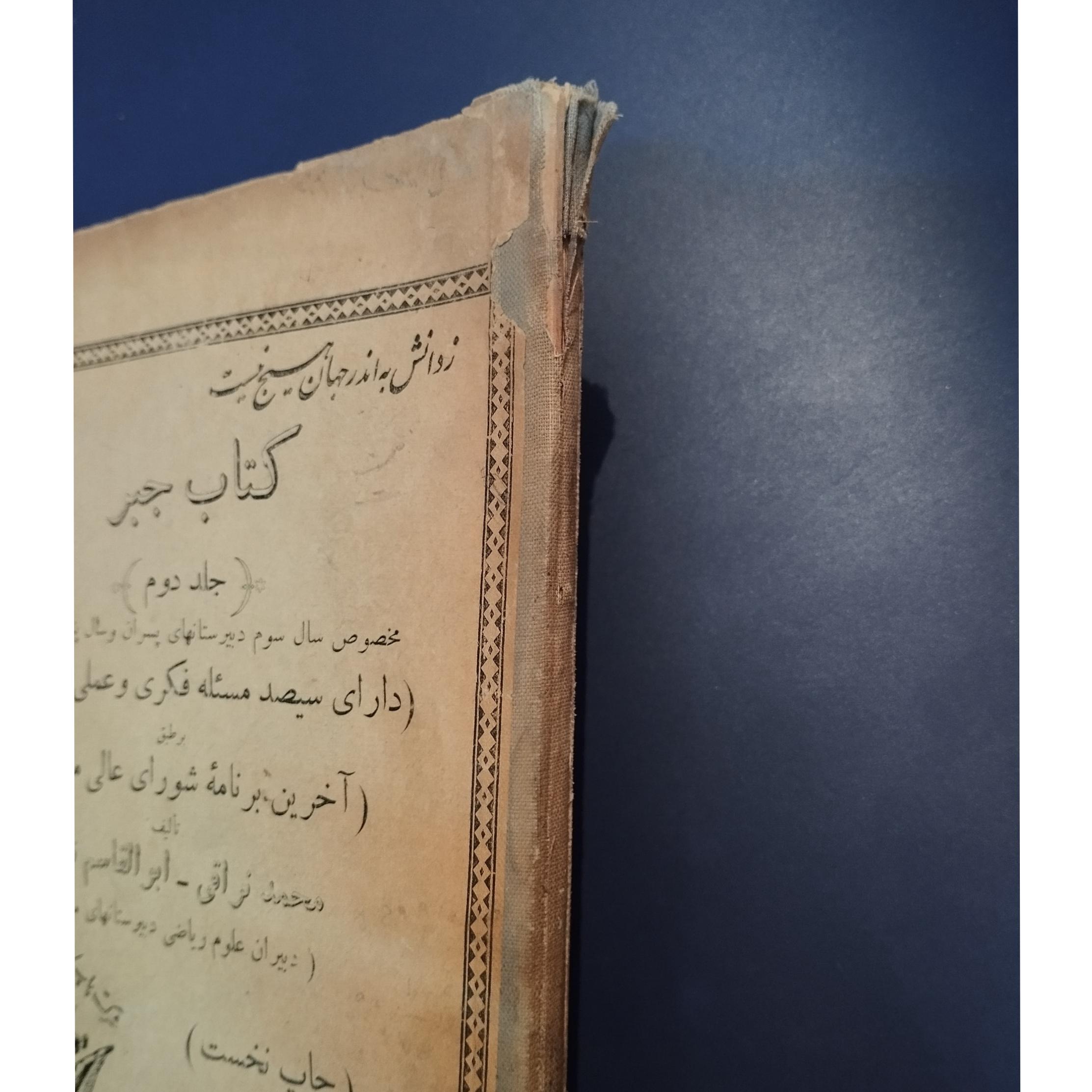 کتاب جبر مطابق تصاویر و عطف کتاب پوسیدگی دارد. کل صفحات نم خوردگی داشتن. با توجه به قدمت و حساسیت کتاب مرجوعی ندارد. هر سوالی در مورد کتاب داشتید در خدمتم
