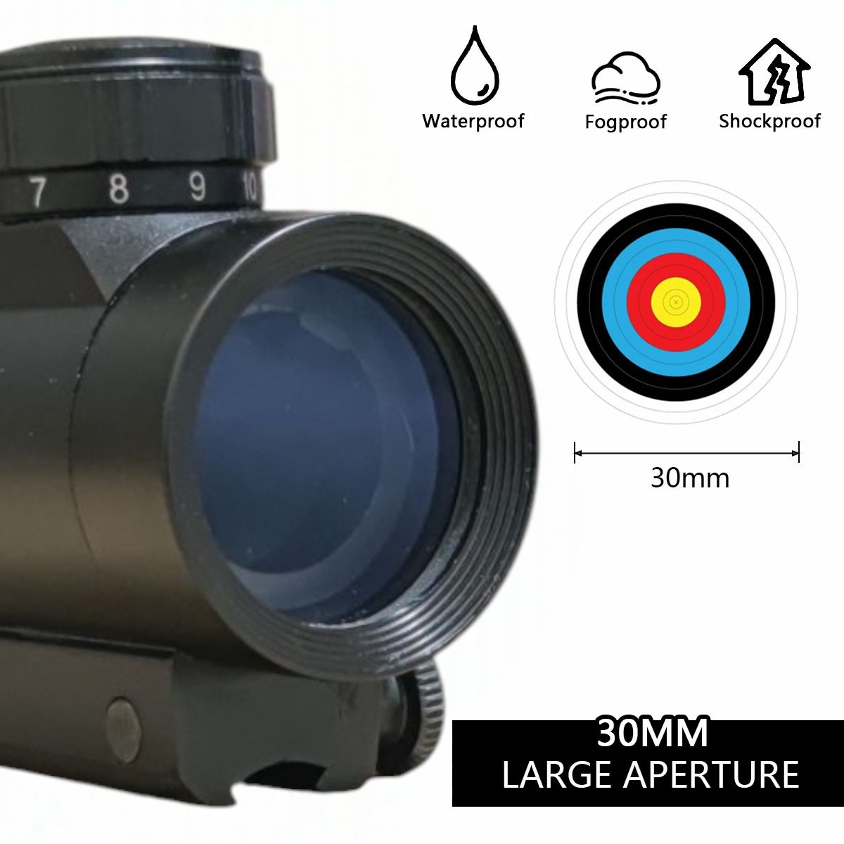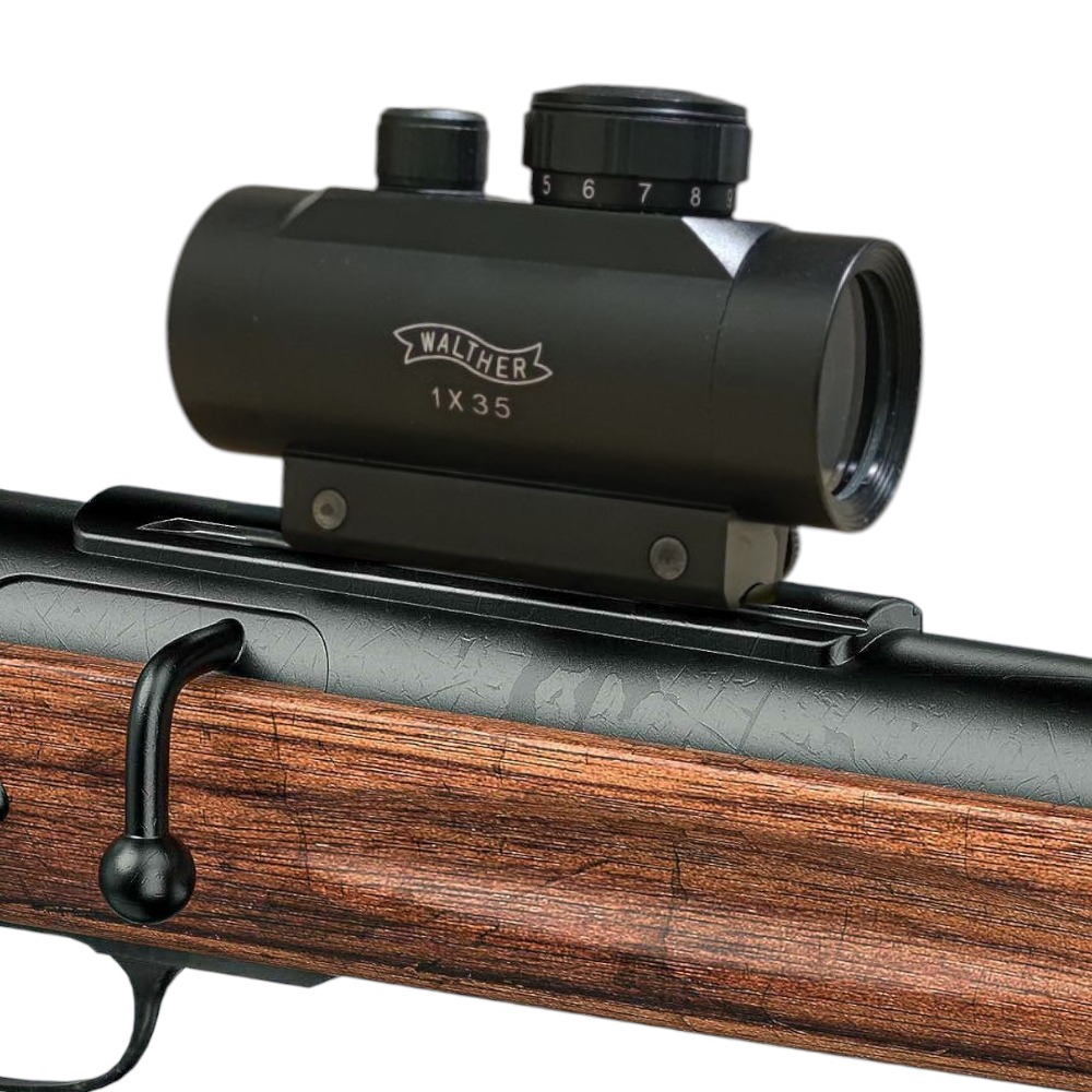 رد دات 30×1 WALTHER با نقطه نوری قرمز رنگ با قابلیت تنظیم شدت نور 11 مرحله ای، مناسب جهت انواع تپانچه ها، تفنگ های بادی و سلاح های شکاری.