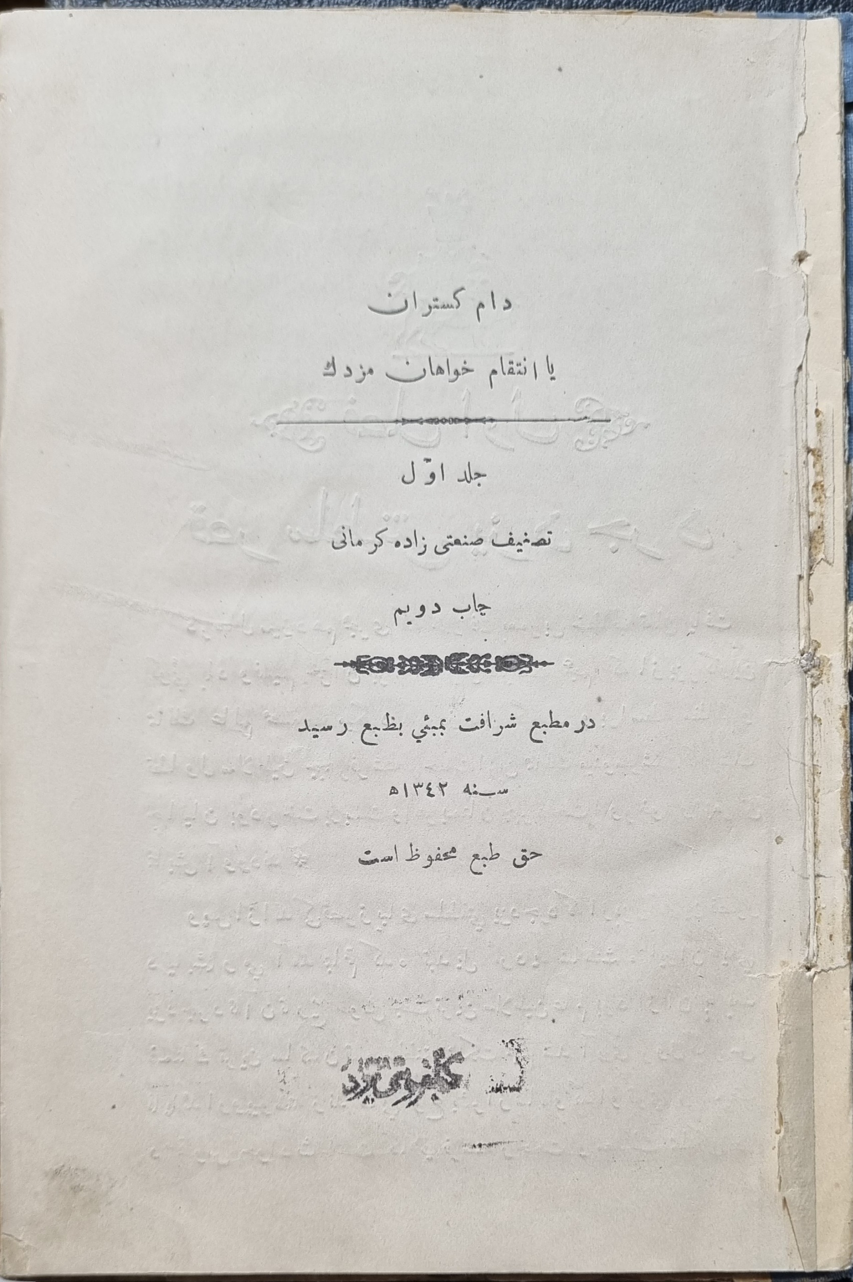 [توضیح: عبدالحسین صنعتیزاده از اولین رمان نویسان ایرانی محسوب می شود. و از وی با عنوان پدر رمان تاریخی ایران نام برده می شود. نخستین رمان تاریخی او به نام «دامگستران» یا «انتقامخواهان مزدک» است؛ و مهمترین اثر او "مجمع دیوانگان".   این کتاب شرح وقایع سلطنت یزدگرد سوم آخرین پادشاه سلسله ساسانی است؛ جلد دوم کتاب در طهران 1304 خورشیدی چاپ شد]
