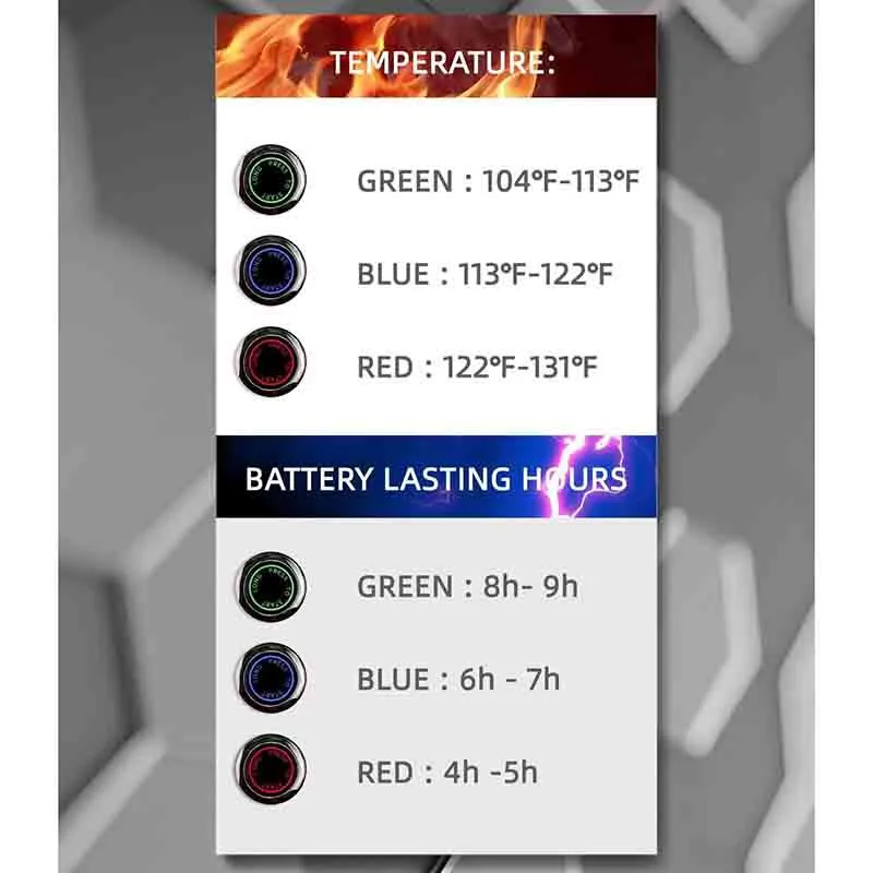 باتری شارژ 7.4 ولت 3000 میلی آمپر ساعت : دستکش های گرم می شوند شامل یک جفت باتری قابل شارژ لیتیوم پلیمری هستند که پس از شارژ کامل 2.5 تا 8 ساعت دوام خواهند آورد و دارای 3 حالت تنظیم دما هستند. دستکش های زمستانی عالی برای فعالیت های داخلی و خارجی. به هوای تازه