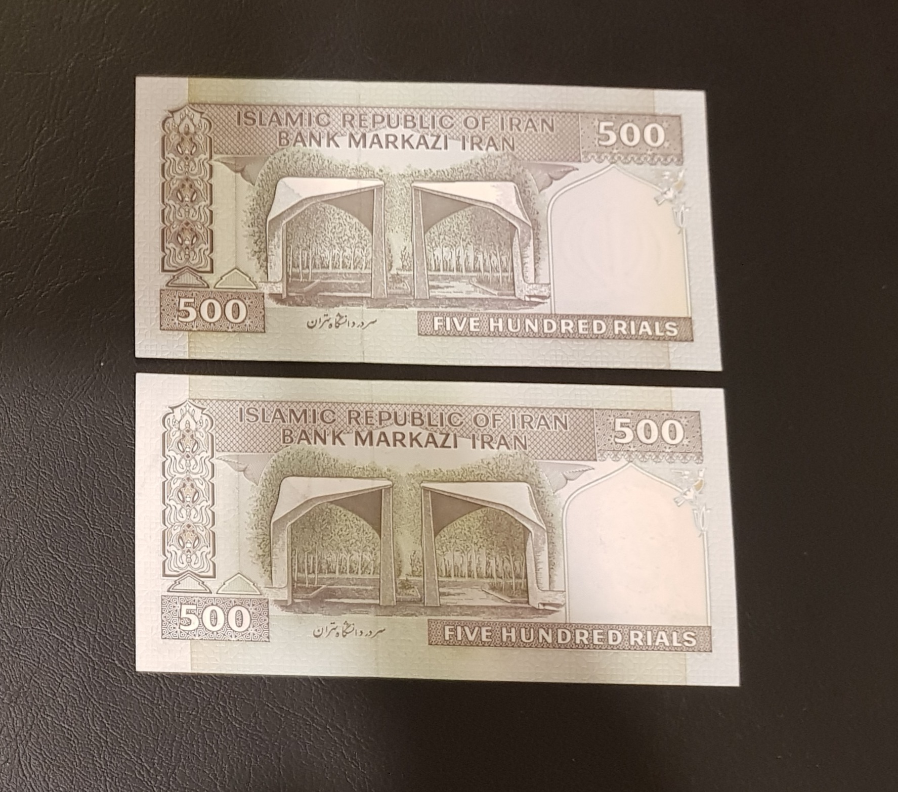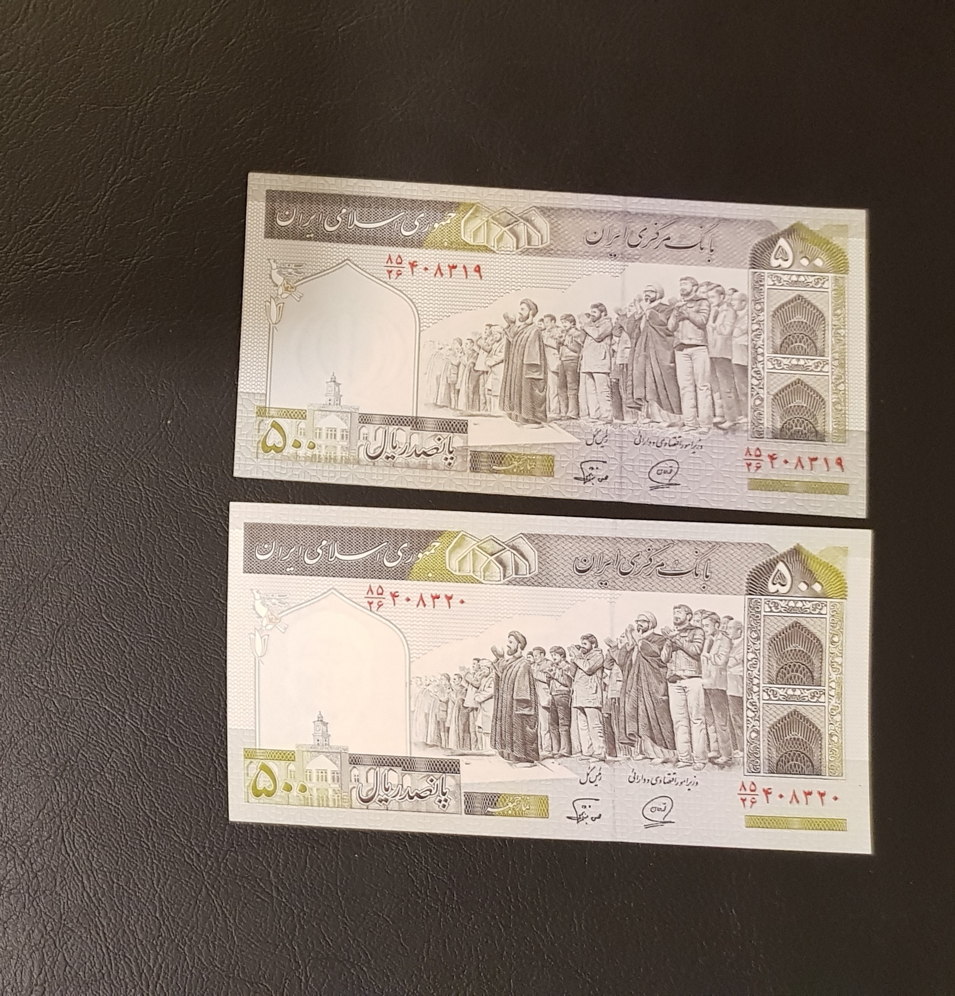 جفت 500 ریالی الله فهمیده رنگ چاپ دو اسکناس متفاوت، زمینه پررنگ و کمرنگ، طبق تصویر