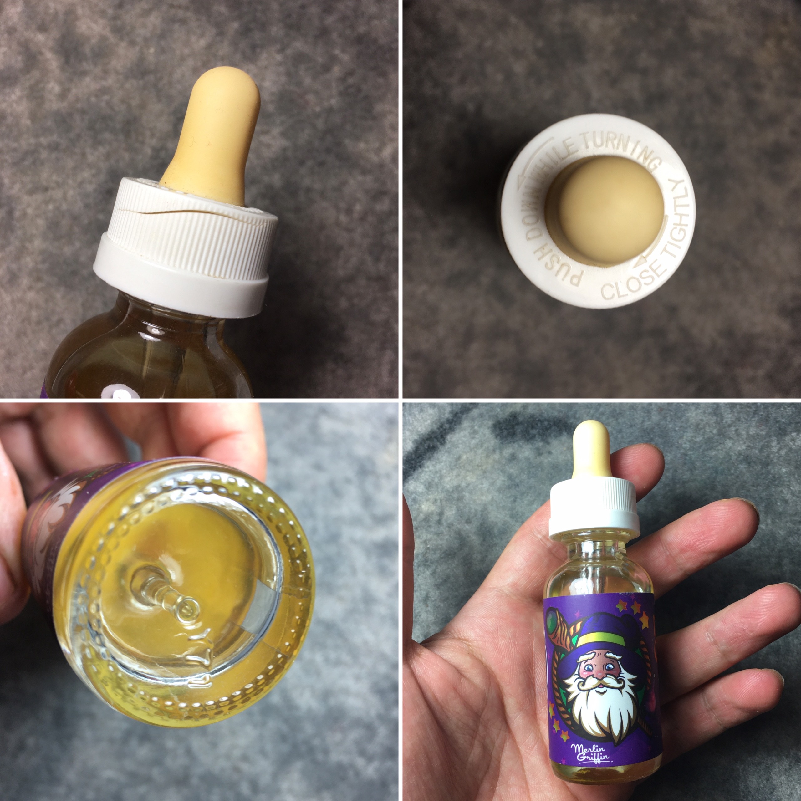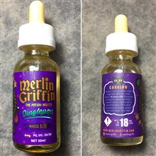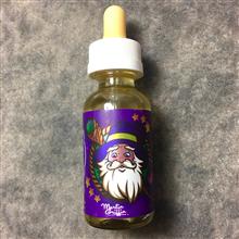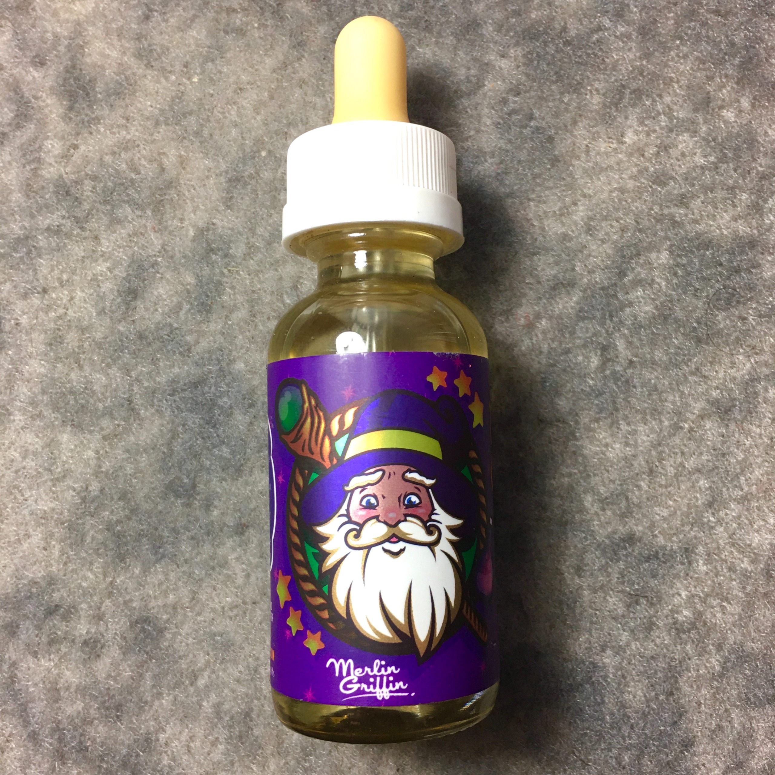 بطری شیشه ای با طراحی فانتزی از برند Merlin Griffin، دارای برچسب رنگارنگ با تصویر جادوگر و نوشته های انگلیسی زیبا.