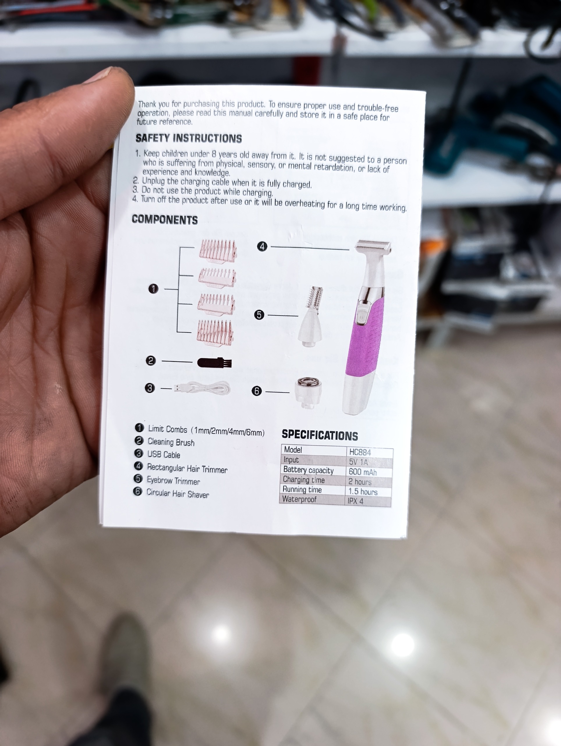 • آنچه دریافت میکنید: 1 عدد ماشین اصلاح موی شرمگاهی تک تیغه برای خانمها، 1 عدد ماشین اصلاح موی دایرهای برای خانمهای بیکینی، 1 عدد ماشین اصلاح ابرو، 1 عدد کابل USB، 1 عدد برس تمیزکننده xa، 1 عدد دفترچه راهنما، 4 عدد شانه راهنما (1 میلیمتر، 2 میلیمتر، 4 میلیمتر، 6 میلیمتر).