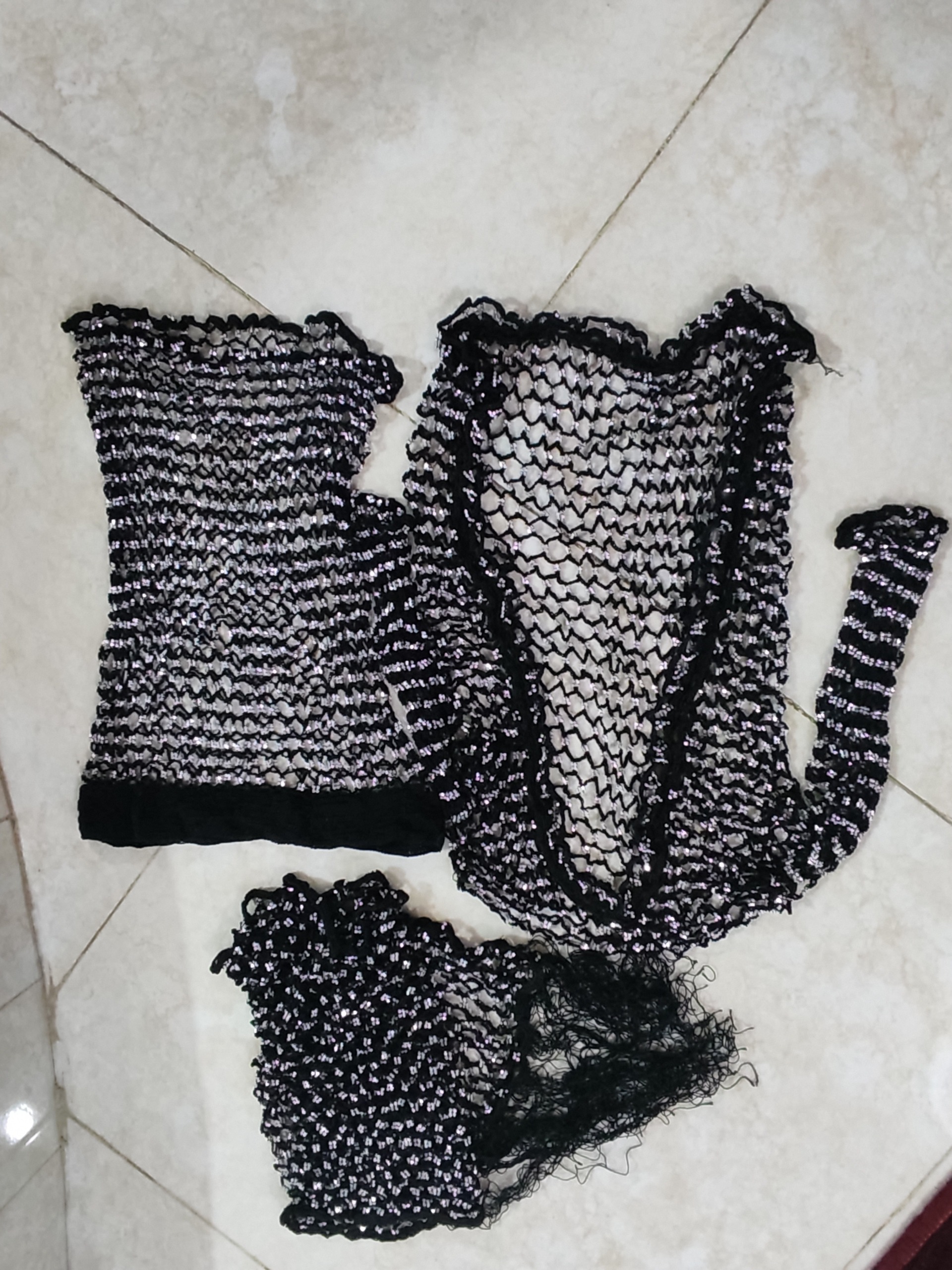 لباس شب مخصوص عروسی ودوران نامزدی..شامل بلوز و دامن و شال..دستباف هستن با مهره نقره ایی رنگ ثابت بافته شدن . فوق العاده شیکن ..مناسب سایز 36 تا 40