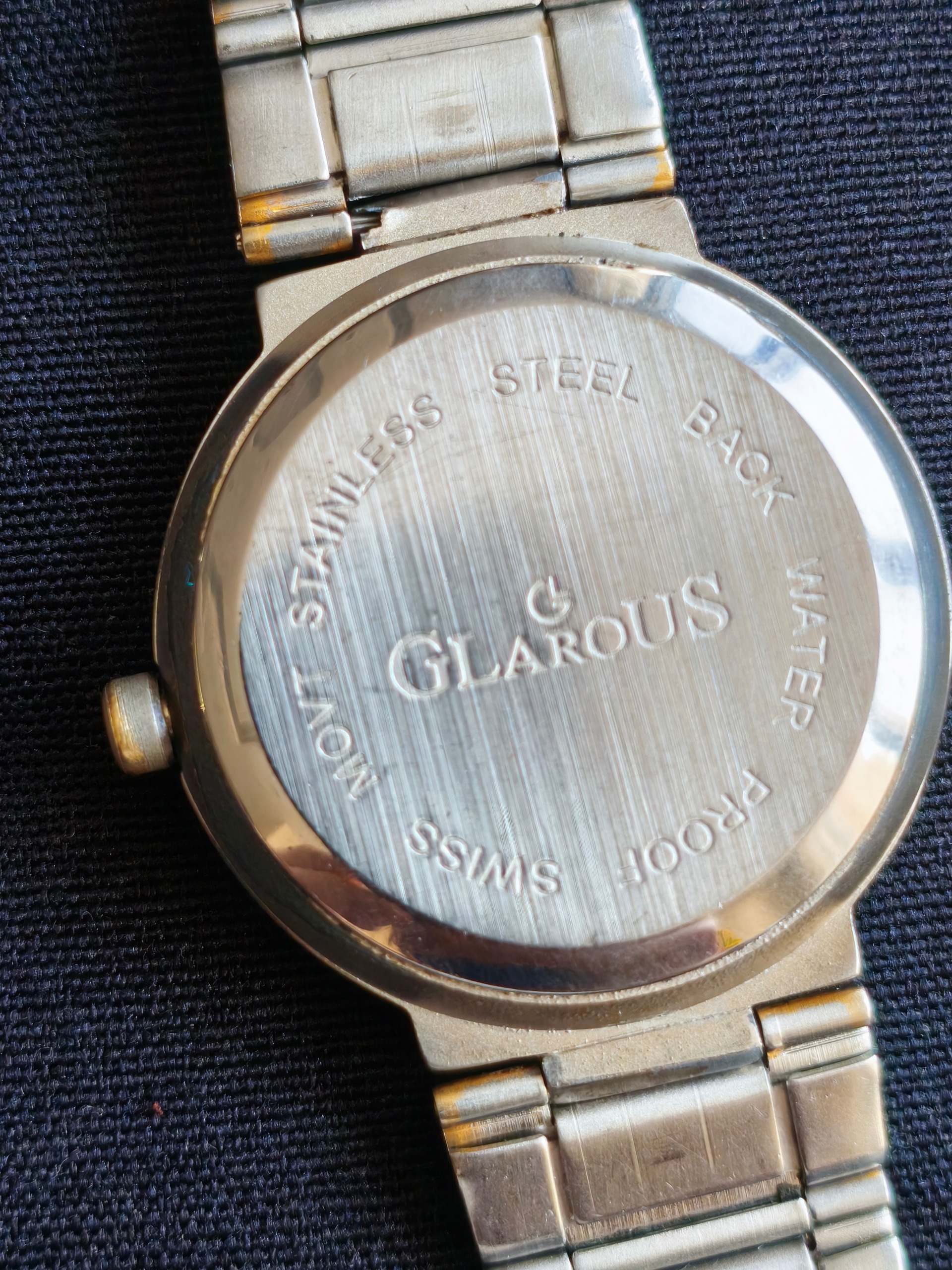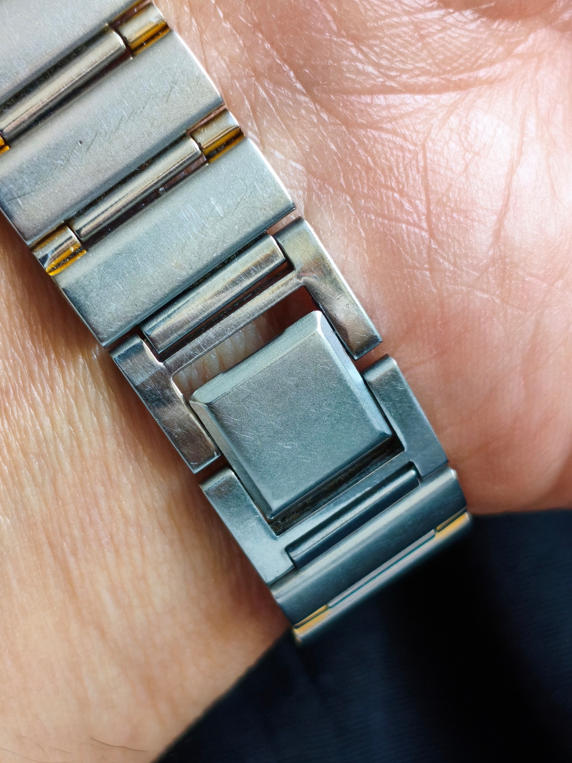 ساعتی کمیاب با طراحی مینیمال دهه 90 میلادی، ساخت سوئیس با موتور دقیق *Swiss Movt* و بدنه استیل ضدزنگ. صفحهی مشکی مات و نشانگر فلزی براق در موقعیت ساعت 12 یادآور مدلهای کلاسیک Movado است؛ ساده، خاص و بهطرز خیرهکنندهای شیک. بند استیل دو رنگ با قفل اصلی سالم و