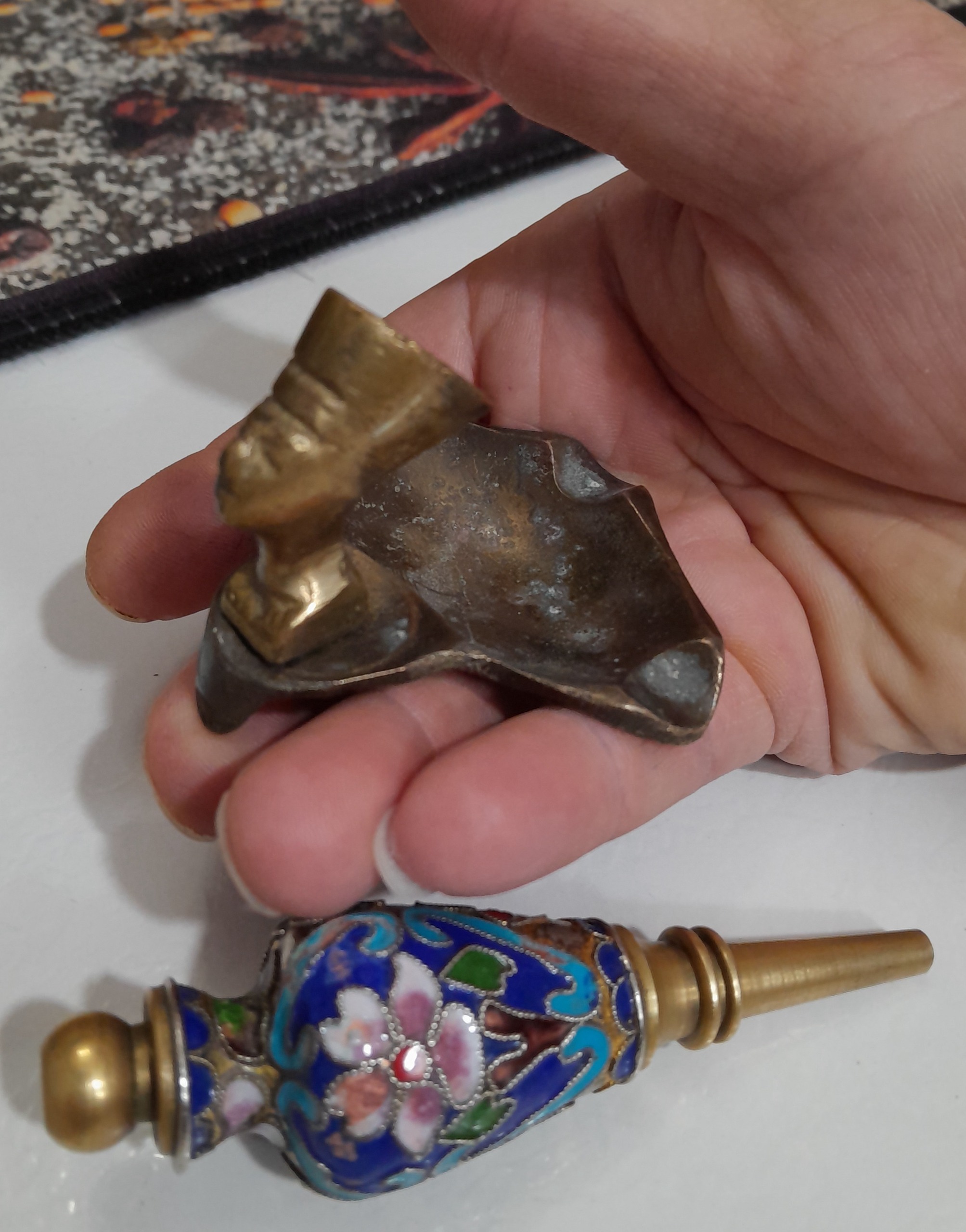 زیرسیگاری کوچک کلکسیونی آنتیک جنس برنجی همراه با لبگیر برنجی میناکاری قدیمی.