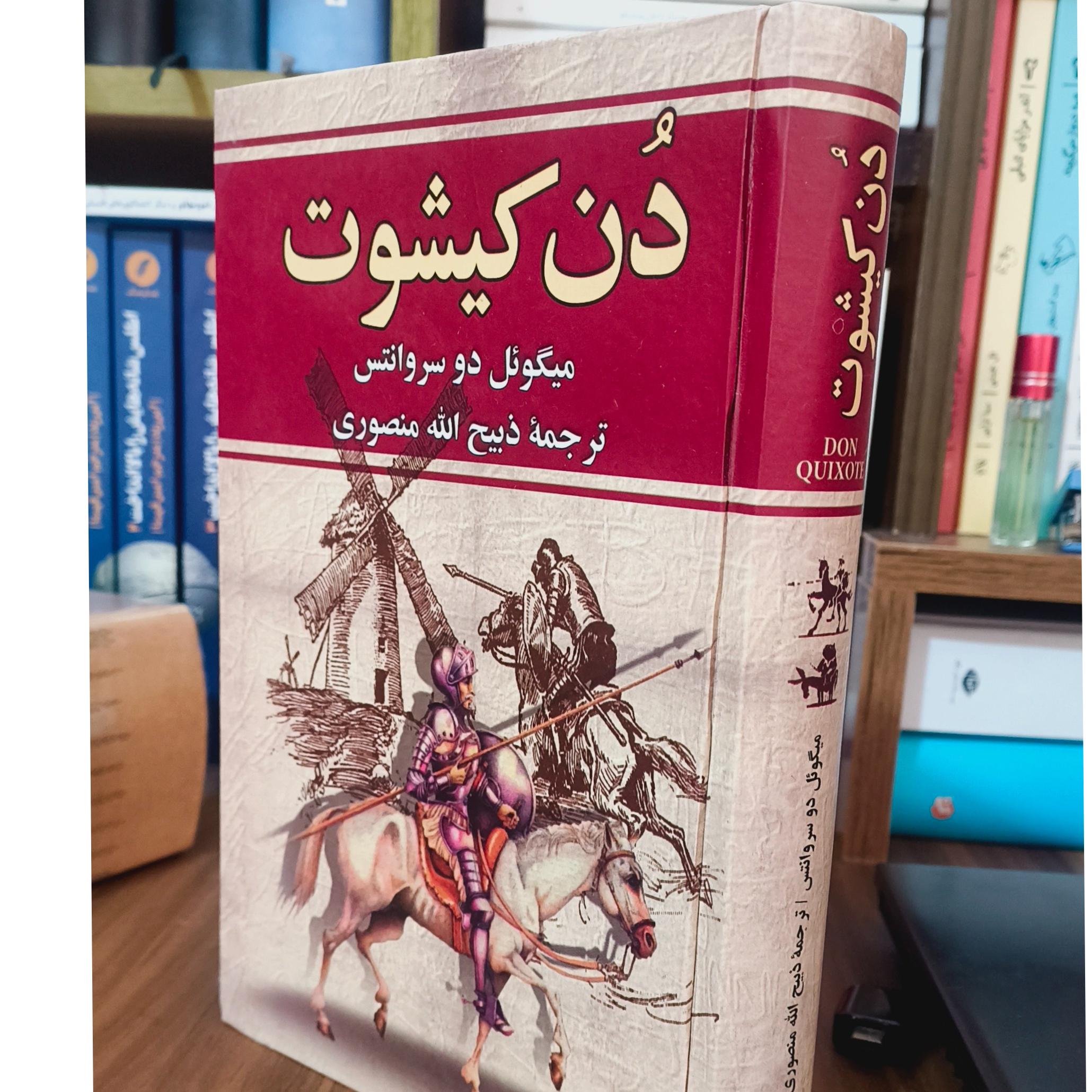 کتاب دن کیشوت، نوشته سروانتس، ترجمه ذبیح الله منصوری، تک جلدی، چاپ اول سال 1389 از انتشارات کتاب وستا، جلد سلفون سخت، کاغذ تحریر سفید، 564 صفحه