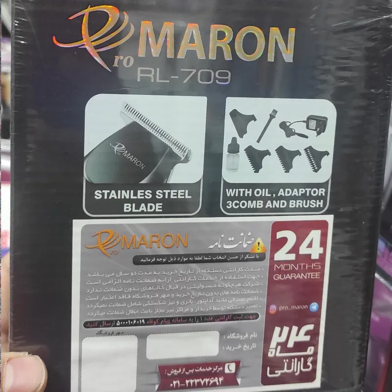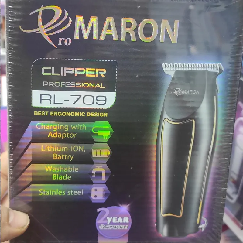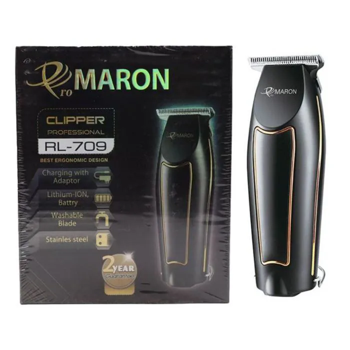 ماشین اصلاح RL-709 یکی از  حرفهای ترین محصولات برند پرومارون بوده و مورد تایید آرایشگران ودارای استاندار اروپا CE میباشد. این دستگاه از کیفیت بسیار بالای برخوردار بوده و توانسته در مدت بسیار کمی طرفداران بسیاری را به خود جلب کند. به دلیل طراحی ارگونومیکی که دارد بسیار خوش دست و کار با آن بسیار راحت است. برای اینکه تیغهی ماشین اصلاح همیشه در بهترین شرایط کارکرد قرار داشته باشد، باید پس از هر بار اصلاح خردههای مو را توسط برس مویی ارائه شده تمیز کرده و مرتباً تیغهها را روغنکاری نمود. ماشین اصلاح پرومارون به باتری قابل شارژ مجهز شده است و قابلیت استفاده با برق مستقیم هم دارد. دارای دکمه توربو. برس مویی و روغن داخل جعبه وجود دارند