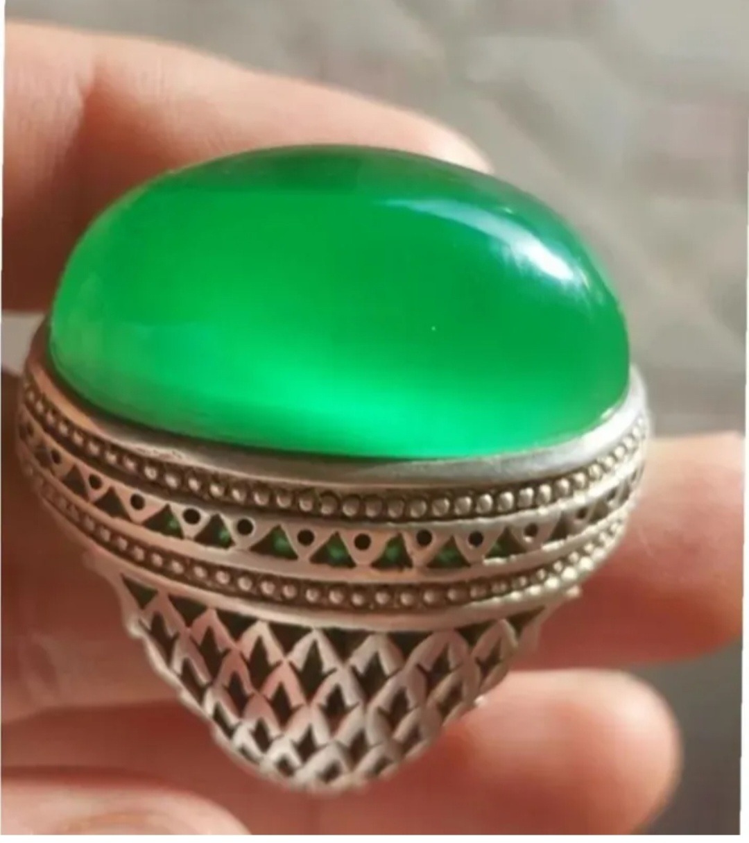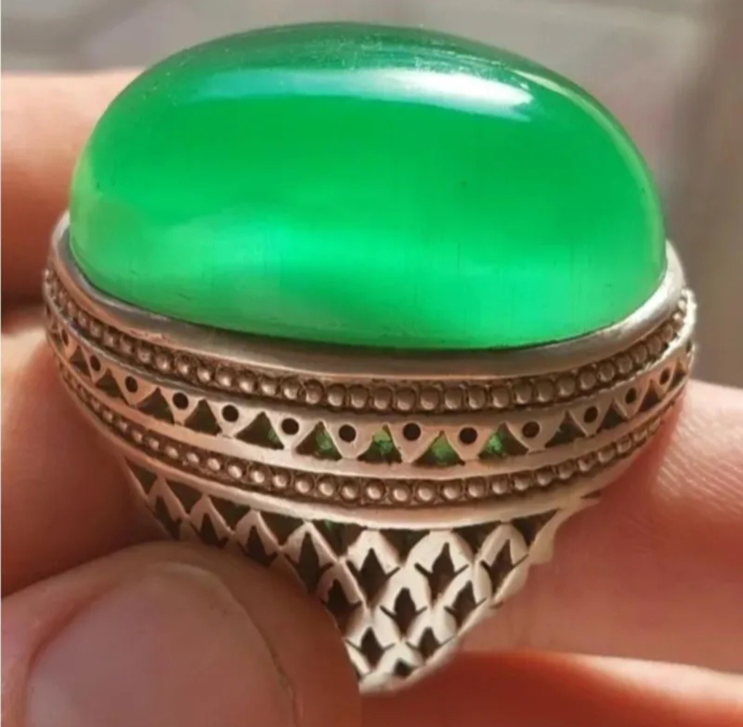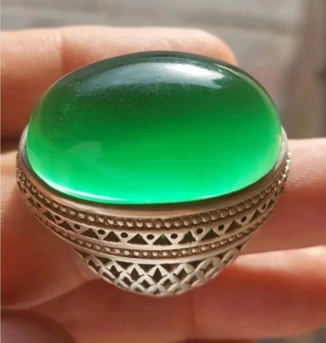بوده و علت رنگ سبز وجود ترکیبات کروم و وانادیوم در شبکه کریستالی سیلیسی میباشد جنس رکاب : نقره دستساز با مهر سازنده شمس