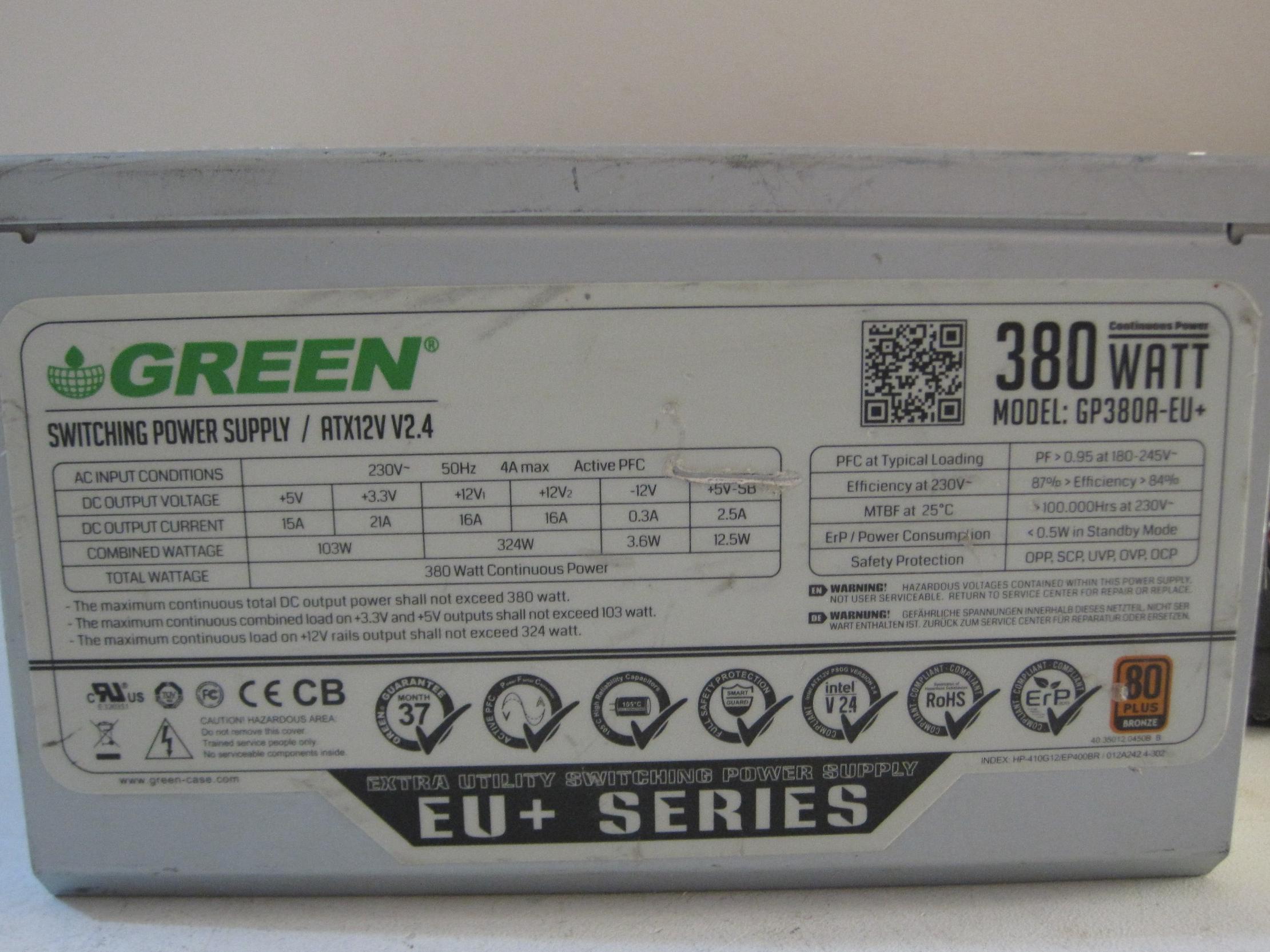 کالا یکعدد پاور 380 وات واقعی از برند گرین مدل GP380A EU+ GREEN میباشد، سوکت برق مادربرد 24 پین و 4عدد ساتا و 2عدد چهار پین سی پی یو دارد.