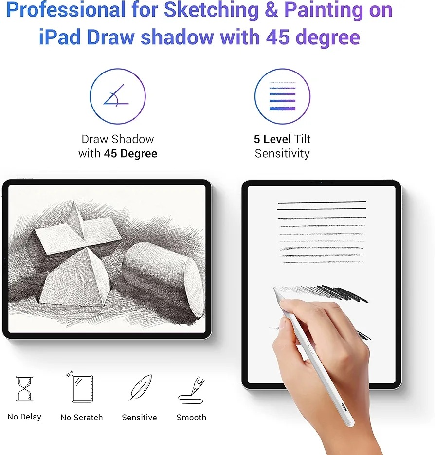 قلم استایلوس با قابلیت حساسیت به کج شدن و عدم برخورد کف دست برای اپل آیپد (2018 و بعد از آن) نسلهای 6/7/8/9/10/11/آیپد پرو 11/پرو 12.9/پرو 13 اینچ/ایر 3، 4، 5، 6/مینی 5 و 6، قلمهای الکترونیکی دیجیتال دقیق برای آیپد