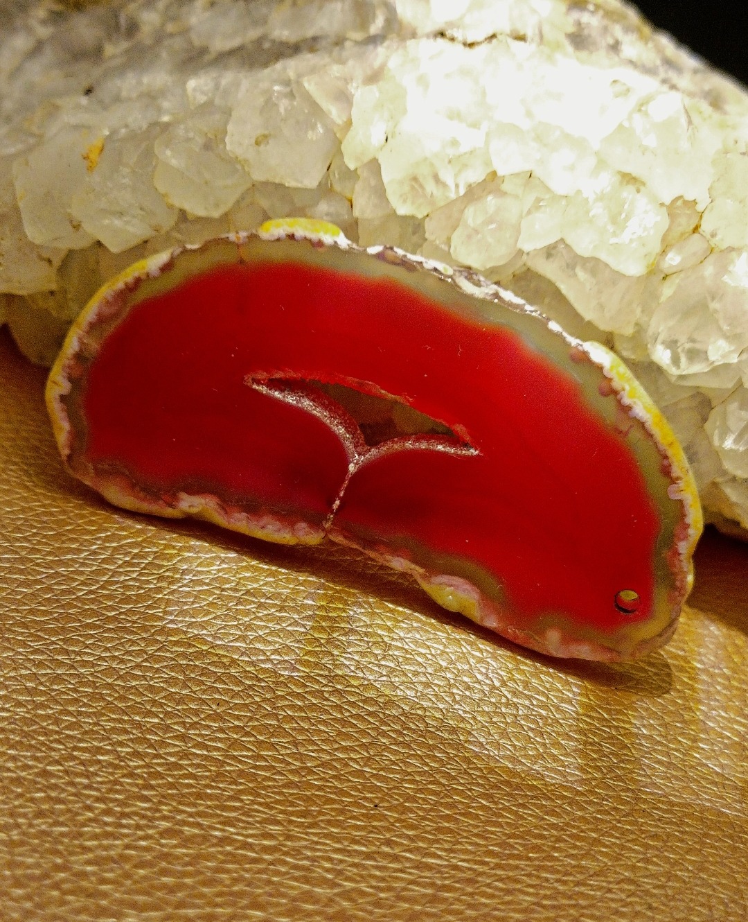 این اسلایس ژئود عقیق صورتی وارداتی از هندوستان با رنگی پررنگ و زنده و تراشی بسیار خوشفرم، جلوهای چشمنواز دارد. سطح آن با پولیش و بهسازی جزئی صیقلی شده تا درخشندگی و جلای طبیعی سنگ بیش از پیش نمایان شود، بدون آنکه انرژی و اصالت معدنی آن خدشهدار شود. این ژئود نه تنها برای کلکسیونرهای سنگ و کریستالهای خاص گزینهای فوقالعاده است، بلکه به دلیل سوراخ بودن قسمت پایین، به راحتی میتوان آن را به آویز یا گردنبند تبدیل کرد و از انرژی خالصش بهرهمند شد.