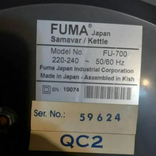 سماور برقی فوما ژاپن در حد آکبند با قوری از زیرش میشه به جا پخت غذا استفاده کرد حتی مارک و کد کالا روشه مخصوص جهاز مرجوعی به هیچ وجه قابل قبول نمیباشد