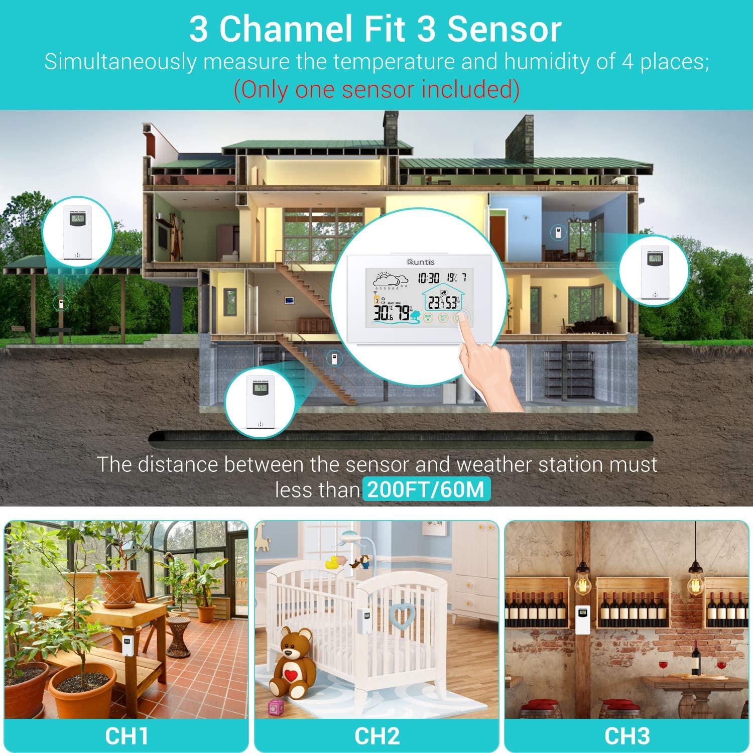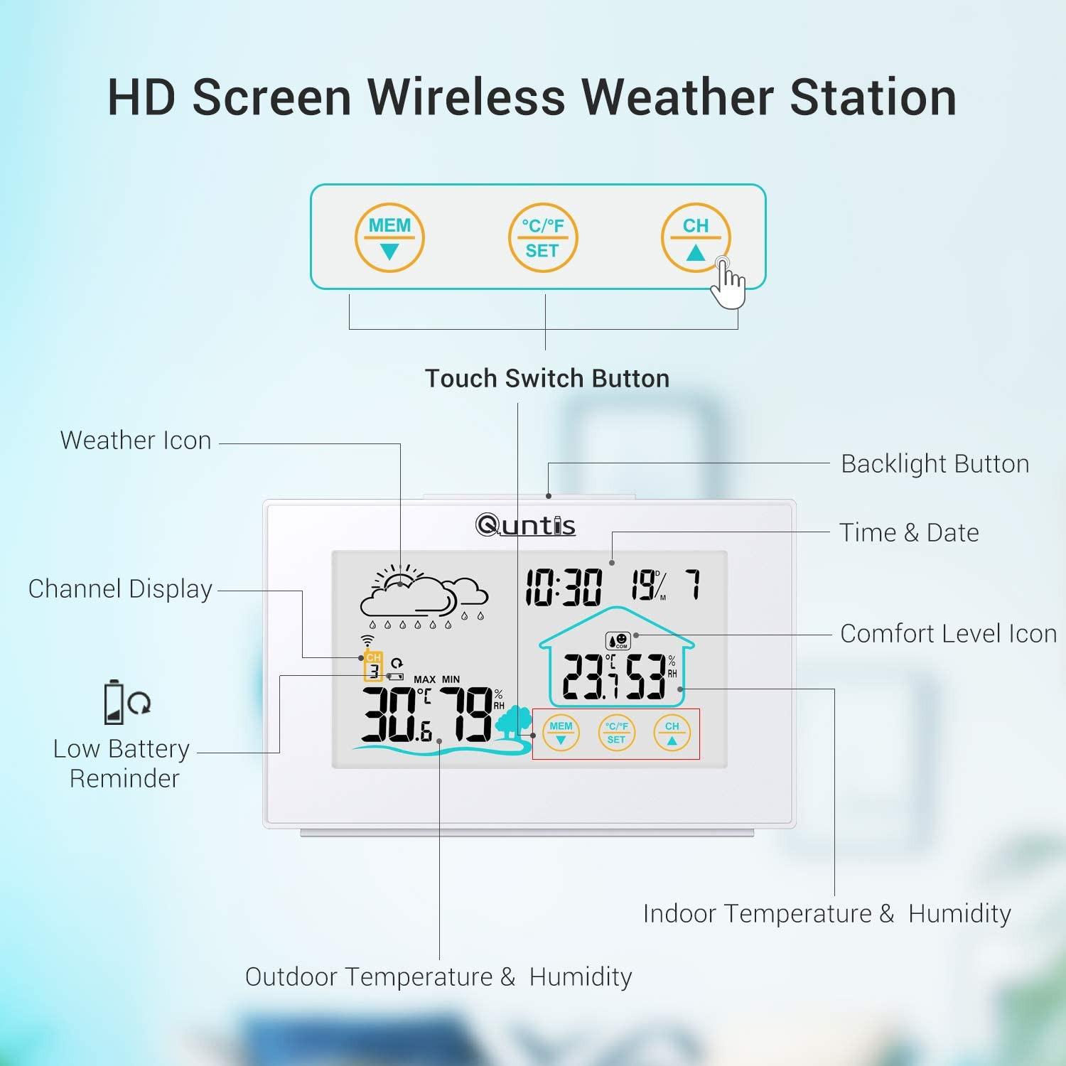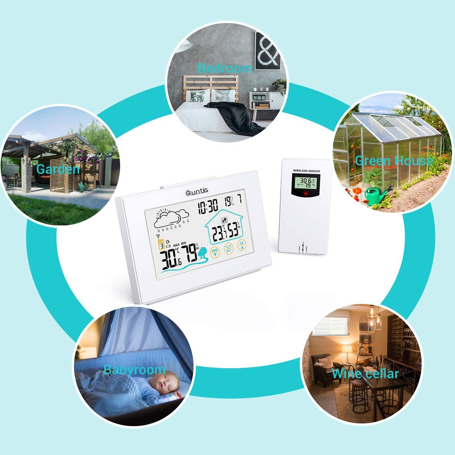 - ایستگاه هواشناسی بیسیم Quntis با 3 قطعه سنسور فضای باز، دماسنج، رطوبتسنج، ایستگاه هواشناسی رادیویی چندمنظوره دیجیتال برای استفاده در فضای داخلی و خارجی با نمایش زمان، پیشبینی آب و هوا،