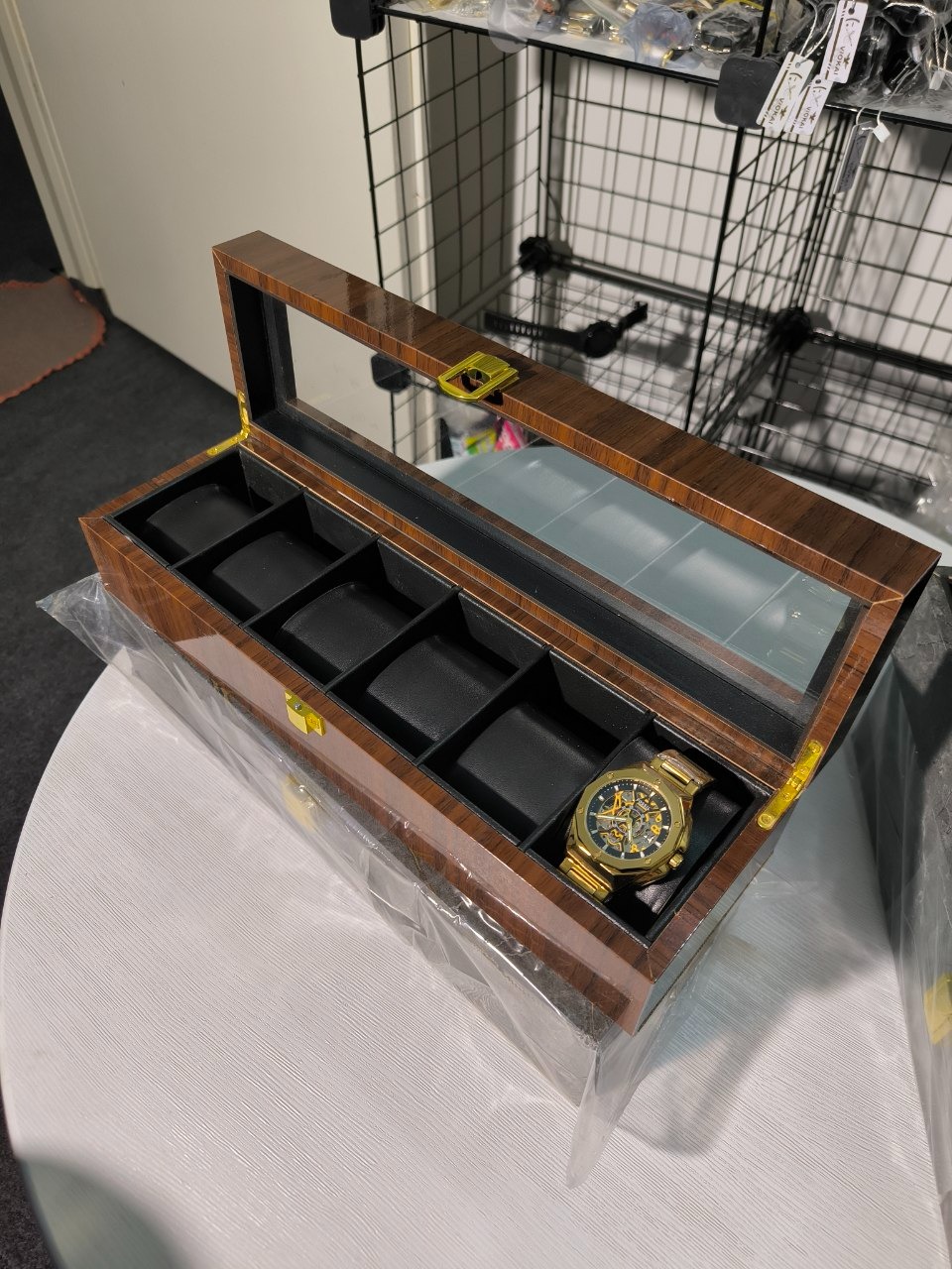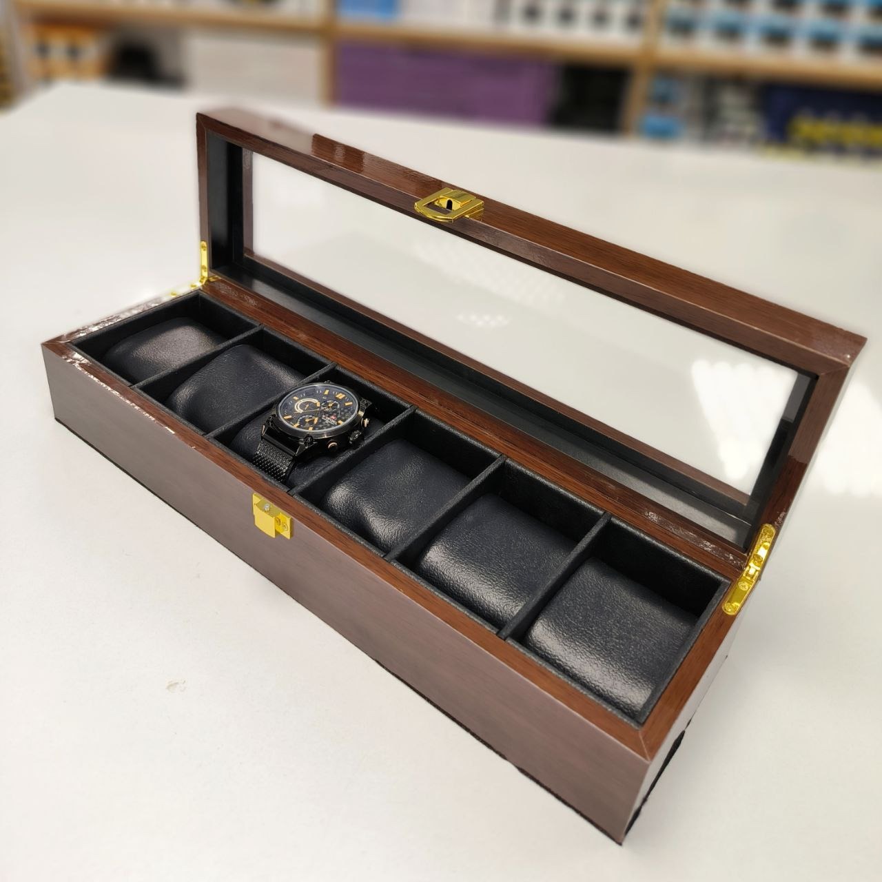 جعبه ساعت 6 خانه هایگلس لوکس انتخابی ایدهآل برای نگهداری ویترینی یا کلکسیونی ساعتهای شماست با بدنه ضد خط و خش و شیشه ویترینی شفاف که جلوهای خاص به مجموعهتان میبخشد مجهز به قفل ضامندار برای امنیت بیشتر و دارای 6 عدد بالشتک