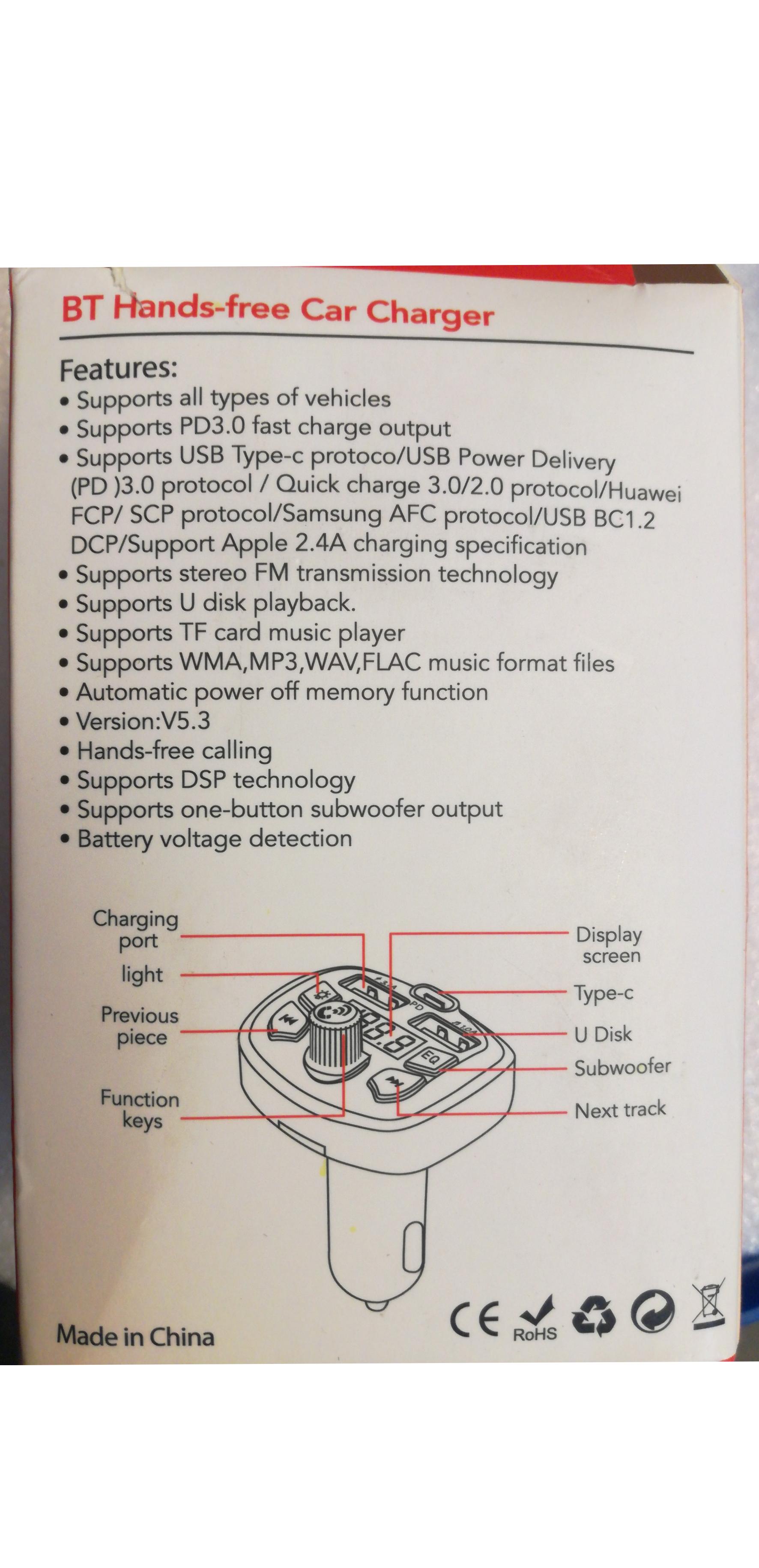 شارژر فندکی و موزیک پلیر خودرو. دارای سه درگاه شارژ. فست شارژ 20 وات و معمولی کارت حافظه خور. دارای چندین حالت اکولایزر موسیقی. چندین نور دور صفحه. بلوتوث دار. محصول آمازون. کیفیت عالی