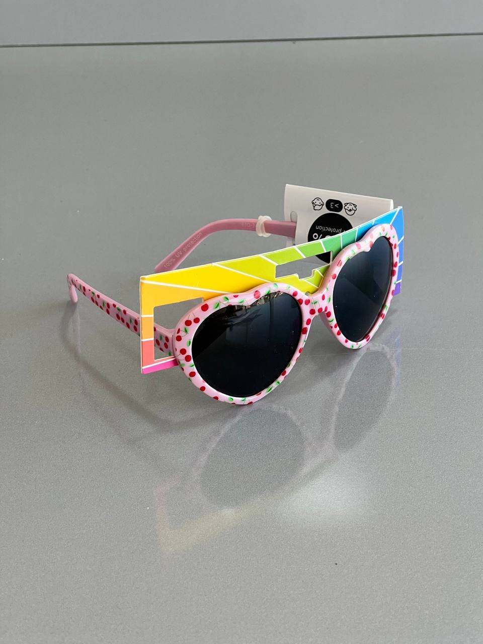 ویژگی اصلی این عینک، فریمهای صورتی روشن به شکل قلب است که فوراً توجه هر کودکی را به خود جلب میکند. طراحی شاد و دخترانه آن با طرحهای کوچک گیلاسهای قرمز و سبز که روی بدنه فریم و به خصوص دستهها تکرار شدهاند، حال و هوای شیرین و تابستانی دارد.
