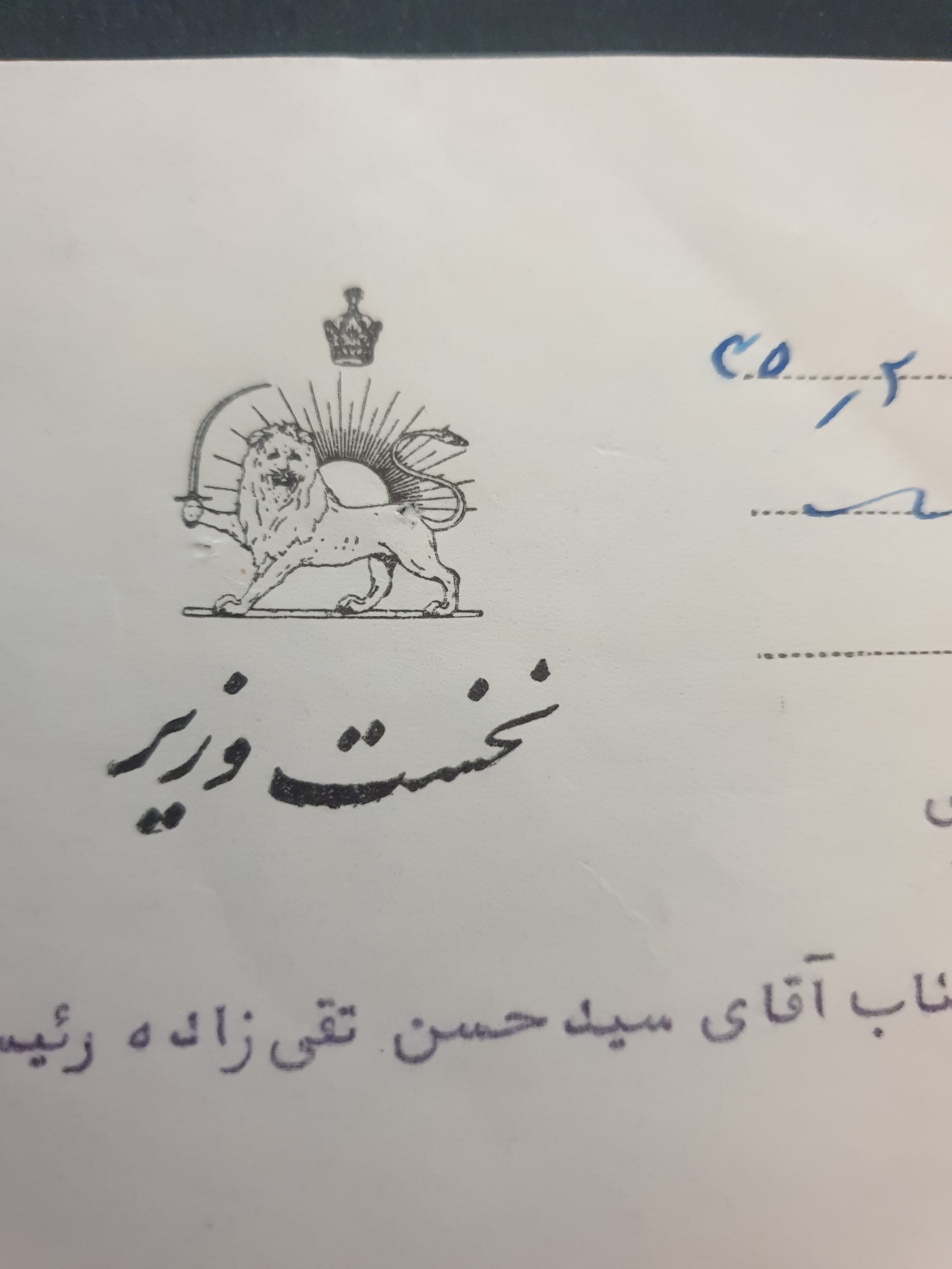 نامه خصوصی حسین علا نخست وزیر به سید حسن تقی زاده با سربرگ نخست وزیری با امضا علا