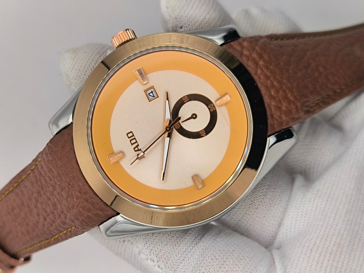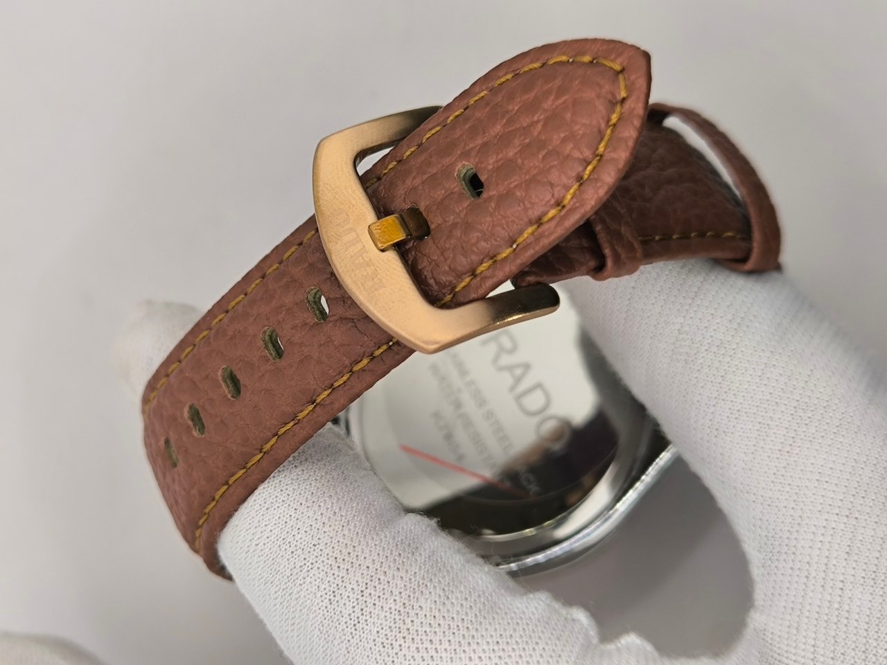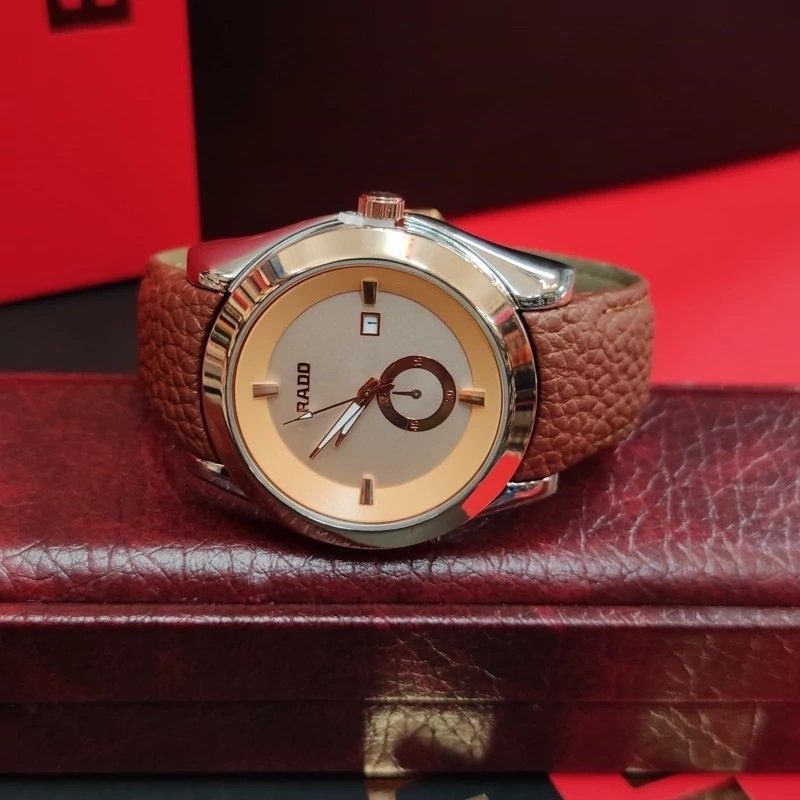 ساعت مچی مردانه RADO با بند چرمی دور دوخت و موتور ژاپن انتخابی شیک و بادوام برای آقایان خوشسلیقه است طراحی کلاسیک با قفل کمربندی و صفحه تقویمدار در کنار عقربههای شبنما استفاده از آن را در هر شرایطی آسان کرده این مدل ضد آب با