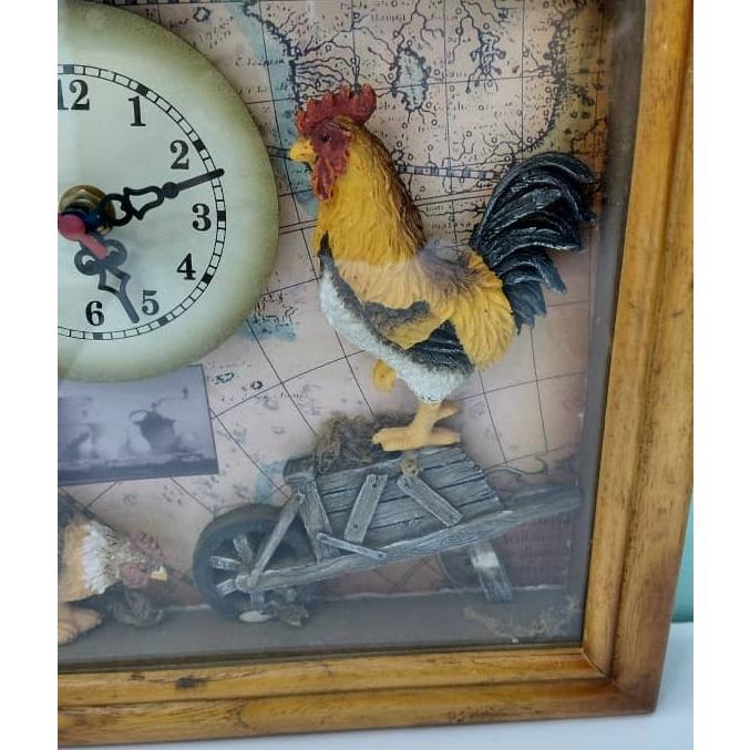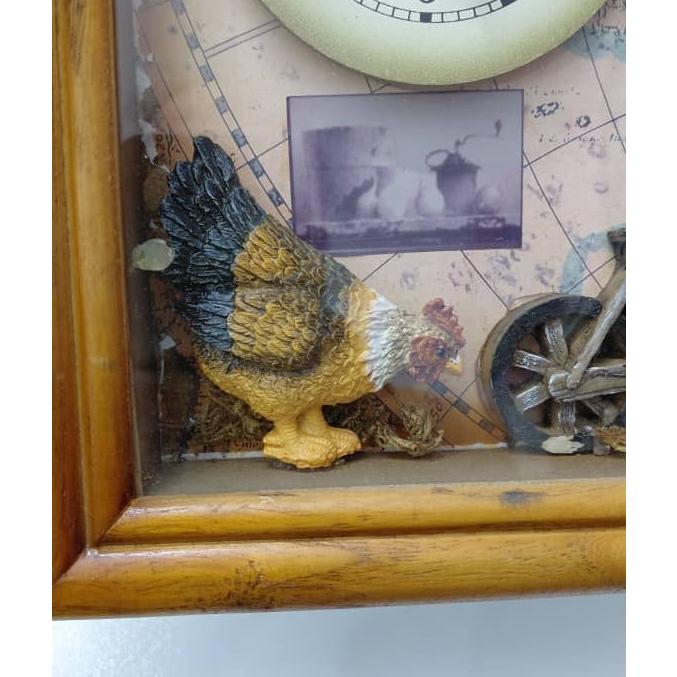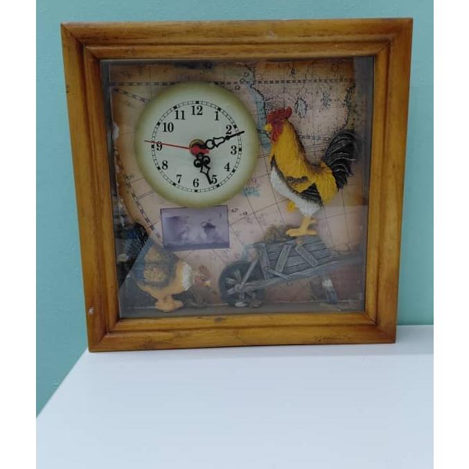 ساعت دیواری با مجسمه رزین مرغ و خروس قابلدار شده به ابعاد 25×25 سانت.ساعت کار میکند کاملا سالم