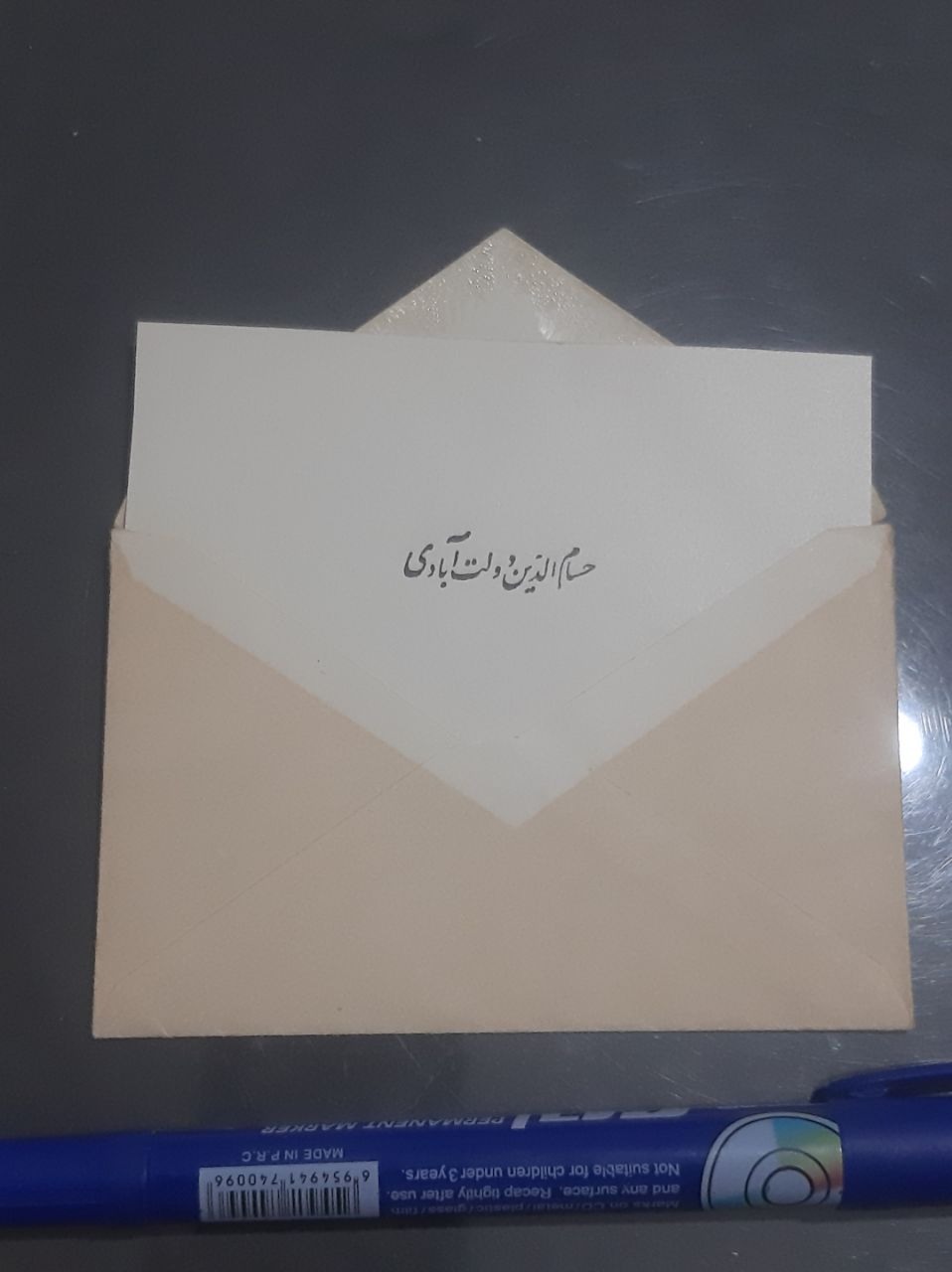 یک عدد کارت تبریک با پاکت مربوطه با خط حسام الدین دولت آبادی
