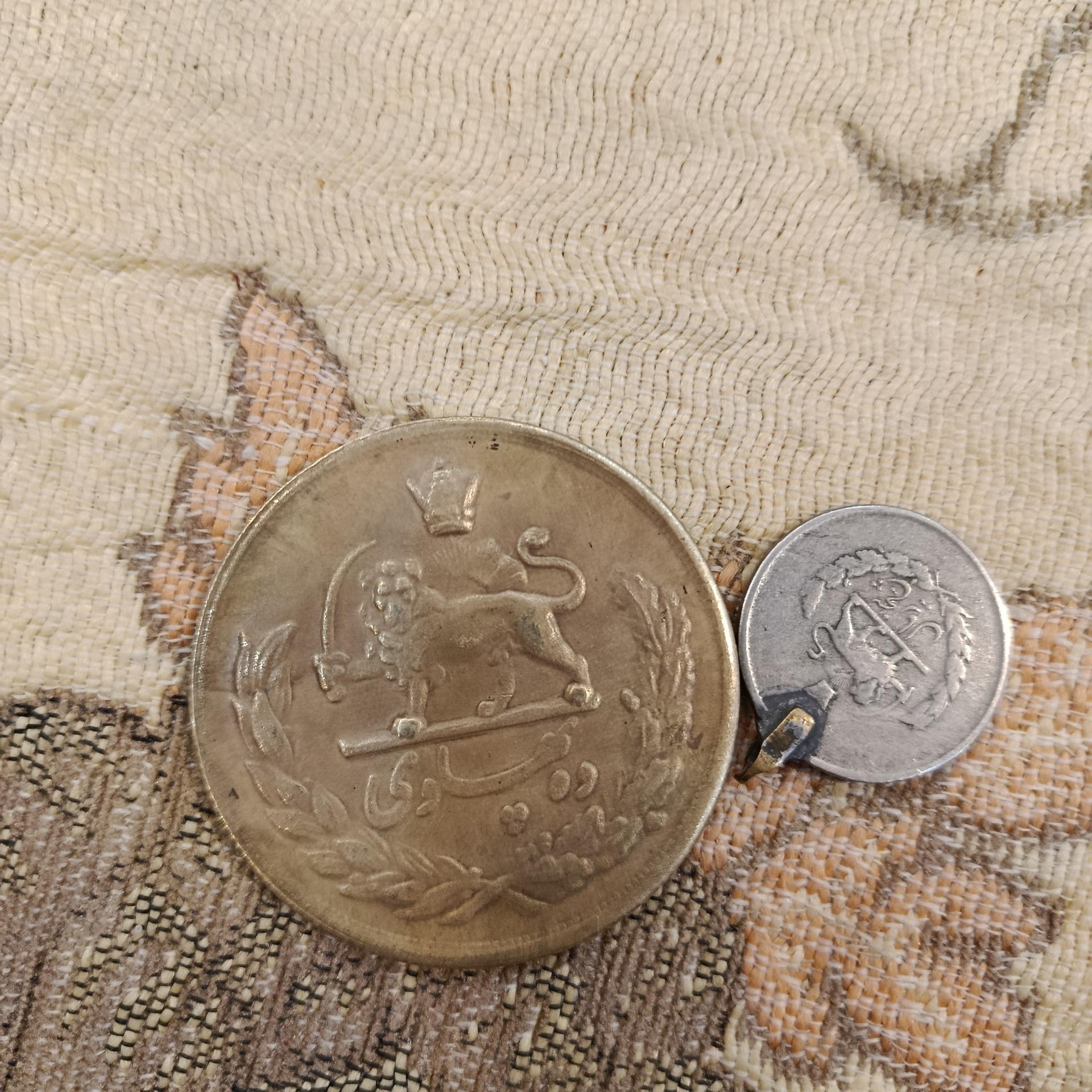 یک عدد سکه قدیمی ده پهلوی مخصوص زده شده بوده اندازه اش را با سکه کناریش میتونید ببینید.نوع جنس را دقیقا نمیدونم چیه