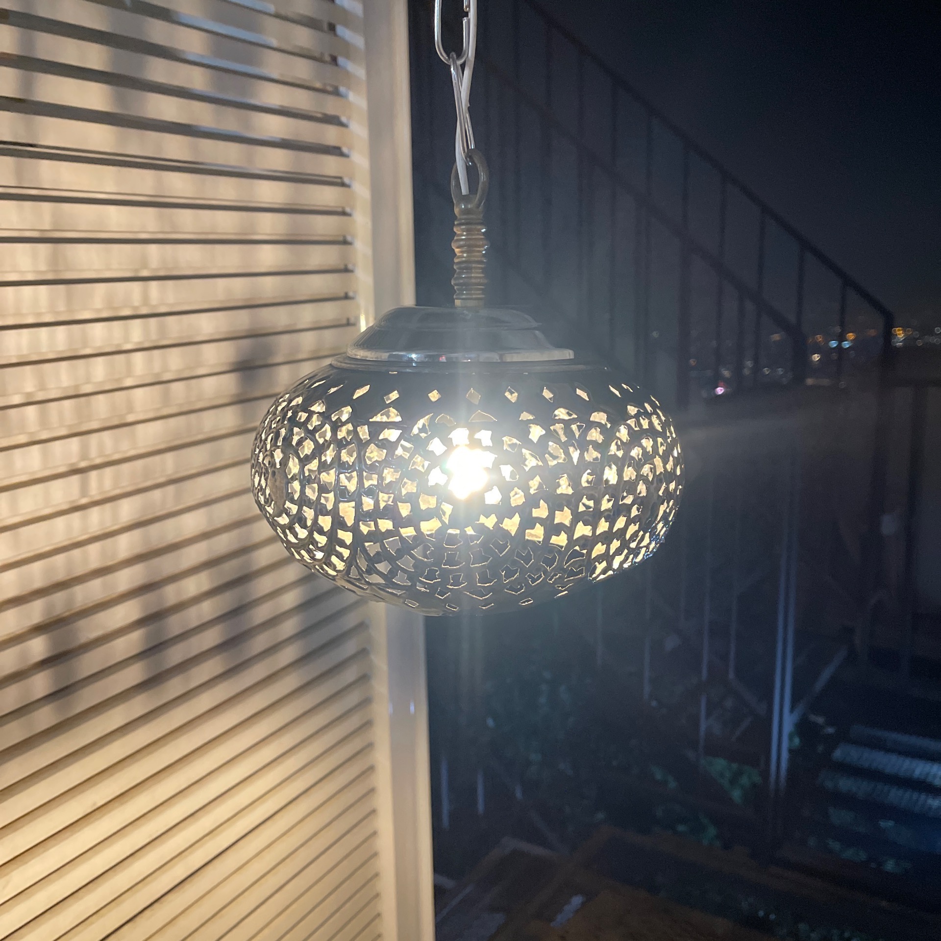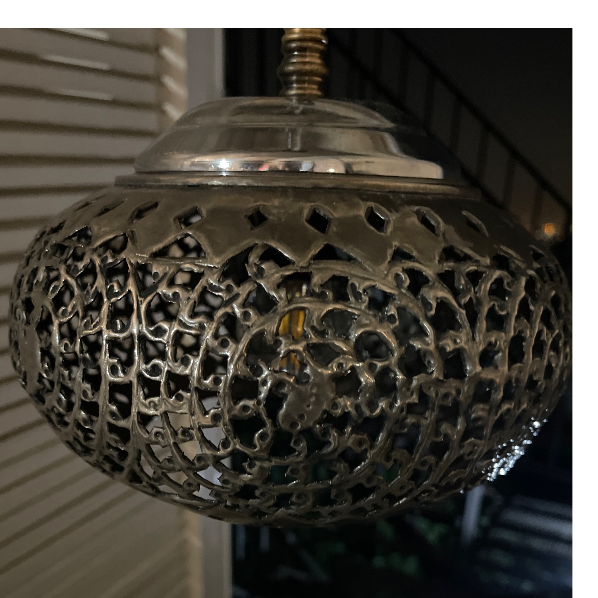 این آویز تک شعله مشبک کار اصفهان و تماما کار دست و چکش کلا از دوتیکه درست شده یک تیکه مشبک و یک تیکه بالای مشبک و تماما چکشی بدون یک نقطه جوش خیلی اصیل و زیبا میباشد و قطر مشبک 35 سانت و کل دور مشبک 70 سانت میباشد و کار شاید حدود 80 سال سن داشته باشد یک کار آنتیک و کلکسیونی